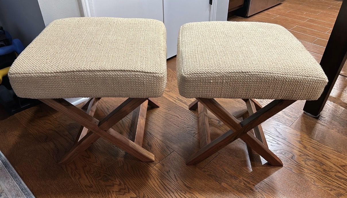 Set of two matching buttercream upholstered stools with ‘x’ wood design base. Great boho finish pieces for any room. Each item measures 18”x18”x18” high. Non-smoking and no pet home.