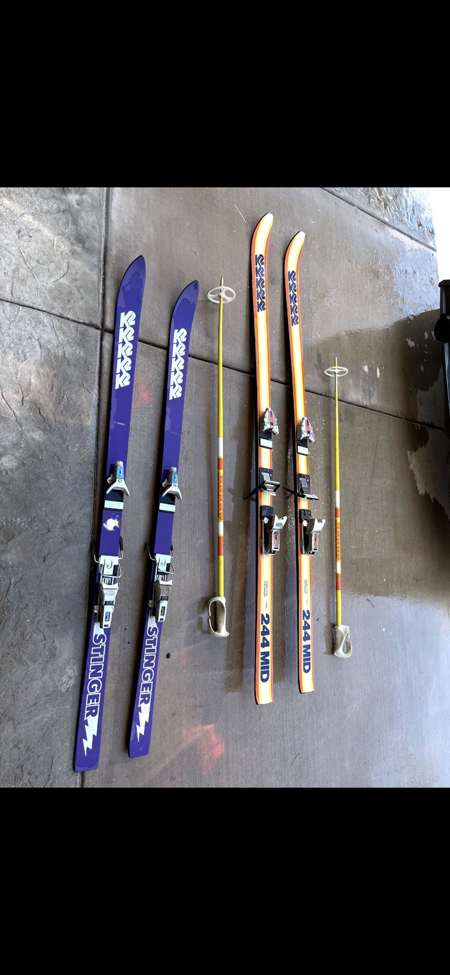 2 sets of ski’s with one set of poles and a ski tote Stingers are size 150s The 244MD size is 185s $40for all