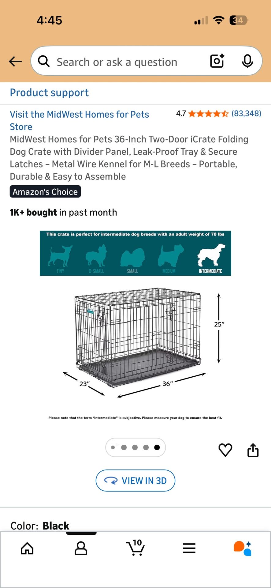 Dog crate: 36”L 23”W 25”H Play pen: 59” 30”H