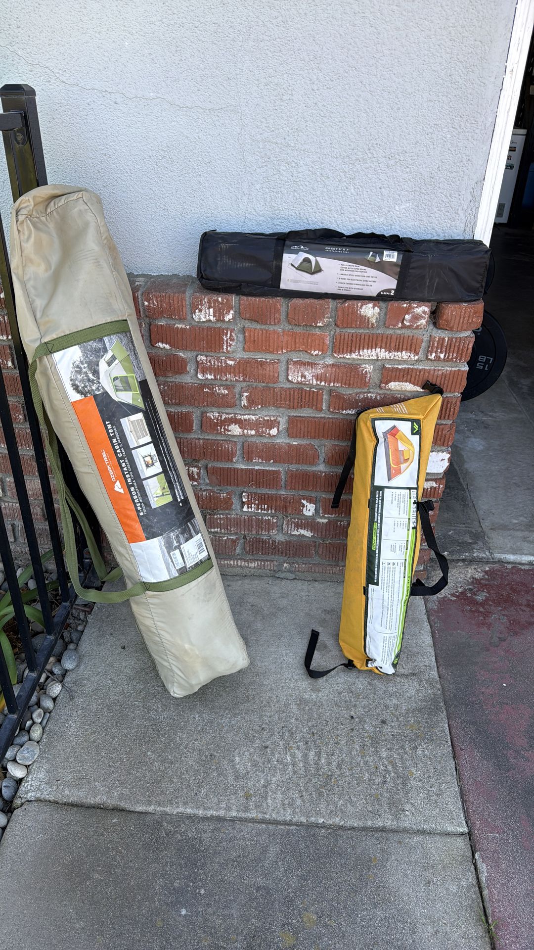 Cleaning out my gear for a fresh start. High-quality tents in great condition. Take the whole bundle for a discount or buy individually. $75 - Ozark Trail 6-Person Instant Cabin (Set up in 60 seconds) $30 - 7'x6' Dome Tent (Great for beach/backyard) $20 - Crest 5'x7' Backpacking Tent (Compact/Lightweight) still inside original box has to be BRAND-NEW BUNDLE PRICE: $110 for all three.