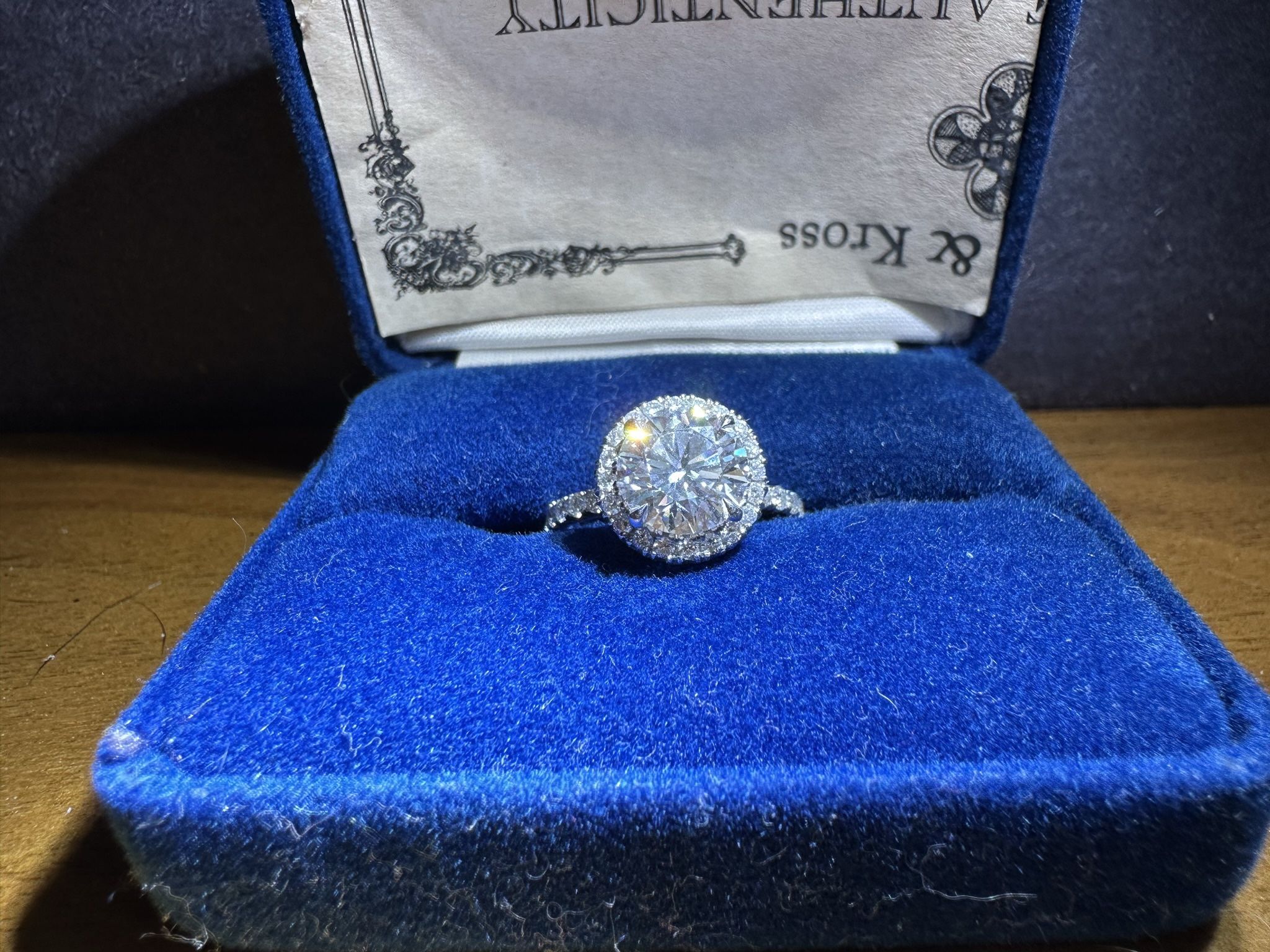 Gorgeous round brilliant lab grown diamond engagement ring. Total carat is 2.60. Clarity VS1, color F. It has 38 melee attribute diamonds that surround the center stone and are along the band. See attached report to validate. 14k White gold which gives it the silver “platinum” look. Size 5 through this jeweler, though I’m usually a size 6 and it fit my ring finger perfectly. Any ring can always be resized easily. It is beautiful, big, and so shiny! Selling because i personally prefer different shaped stones and am looking to sell fast so i can get a different type of engagement ring! Originally priced at $6500 out the door, selling and hoping for 2400 but willing to negotiate.
