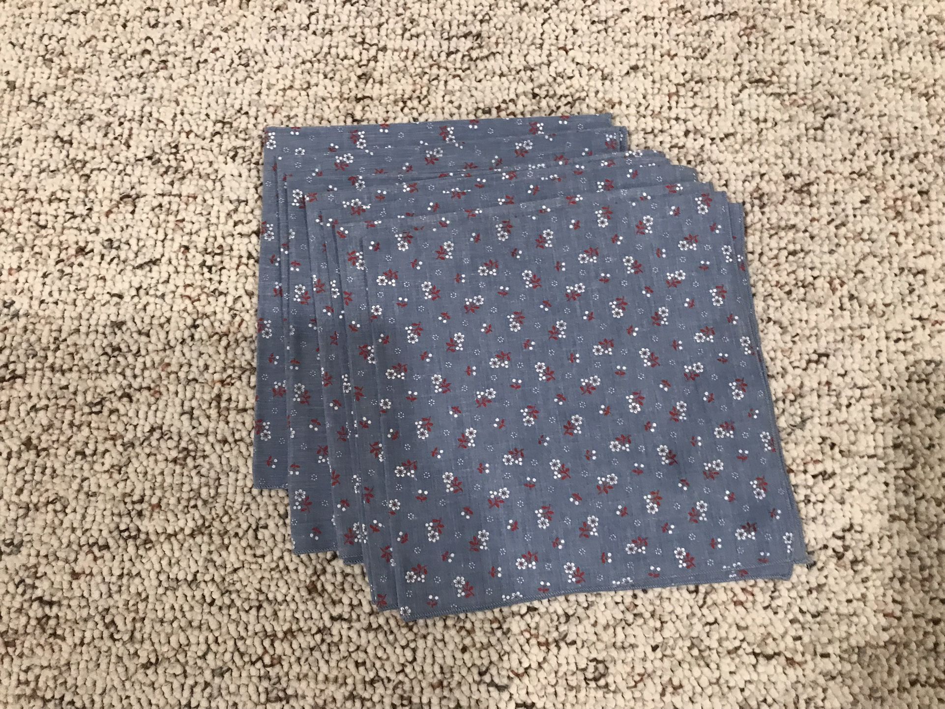 Set of 8. Red, white floral on denim blue background. 17”x 17 1/2”. New never used. Cotton