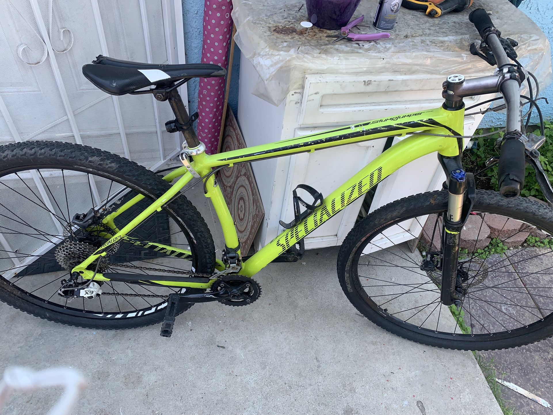 Rides good all gears work Has adjustable front shocks Disc brakes 29” rim Aluminum frame super light weight