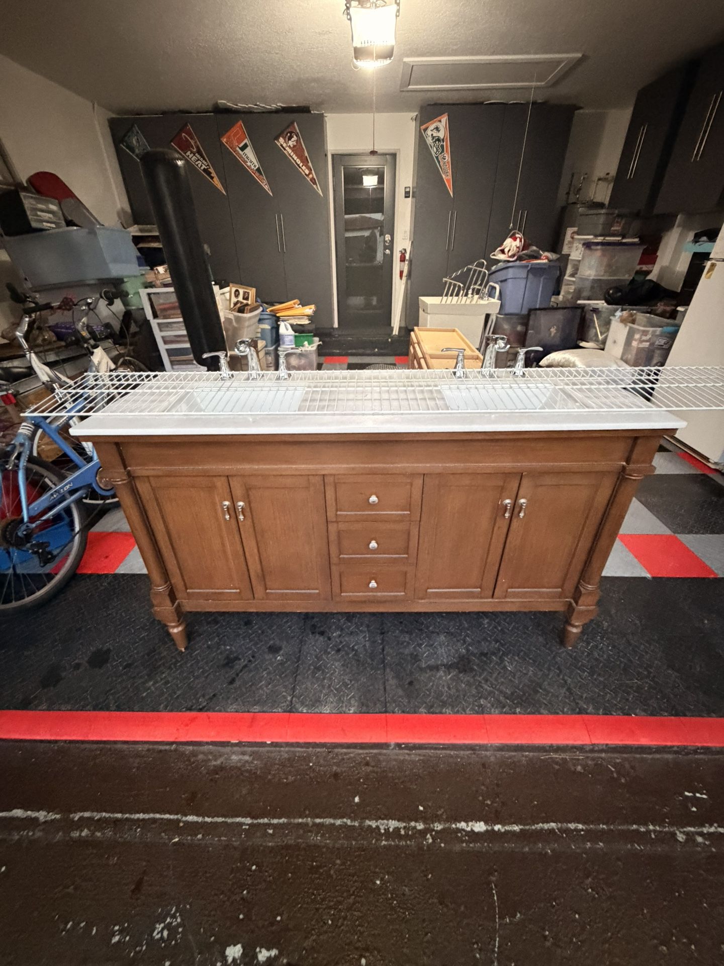 Wooden double sink cabinet and 2 wall mounting cabinets for free. Will be disposed of by next week. If you want them you must come and pick it up