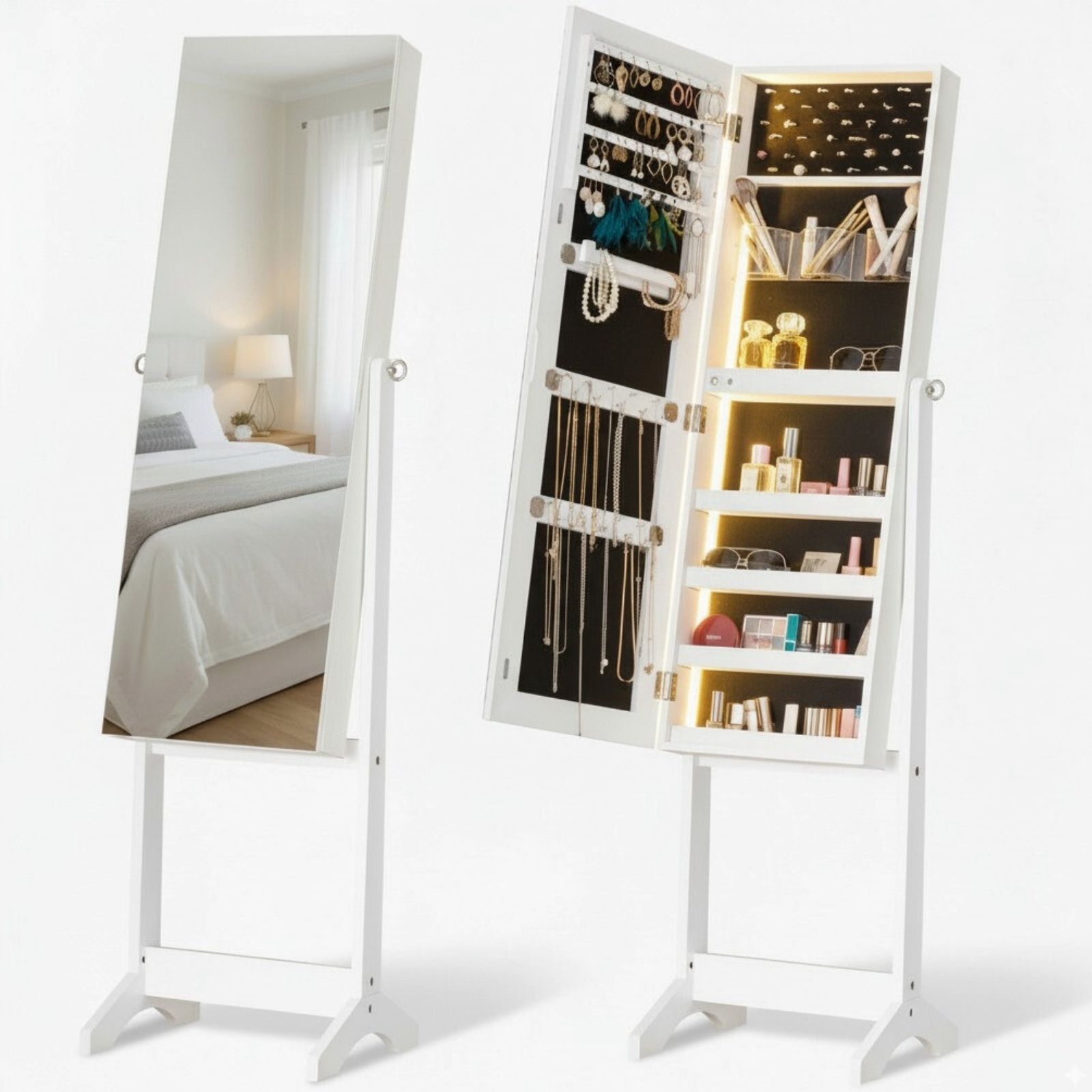 Sleek frameless glass mirror (47.2" x 14.6") provides a full-body view with crystal clear reflection. Perfect for trying on outfits, makeup checks, and styling accessories while doubling as a modern jewelry storage cabinet. : Store and organize all your valuables with 7 layers of ring holder, 1 bracelet bar, 5 cosmetic shelves, 20 necklace hooks, and 4 layers of earring slots. Plenty of space for jewelry, makeup, skincare, and accessories in one organized storage container : Keep your jewelry, makeup, and beauty essentials safe from kids or unwanted access. The mirror armoire ensures privacy and security while maintaining a neat, clutter free room. : Pre assembled cabinet frame with included hardware and clear instructions allows for fast installation in minutes. Ideal for standing use as a jewelry cabinet with mirror storage solution. : Built with durable MDF and eco-friendly materials, featuring a curved leg design for stability and tip over prevention. A chic and functional jewelry organizer armoire that complements bedroom, dressing room, or closet décor