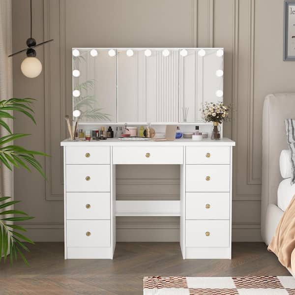 White Modern Makeup Vanity Desk 9 Drawers Wood Dressing Table With 3 Mirrors, Hidden Storage Shelves, LED Bulb Lights