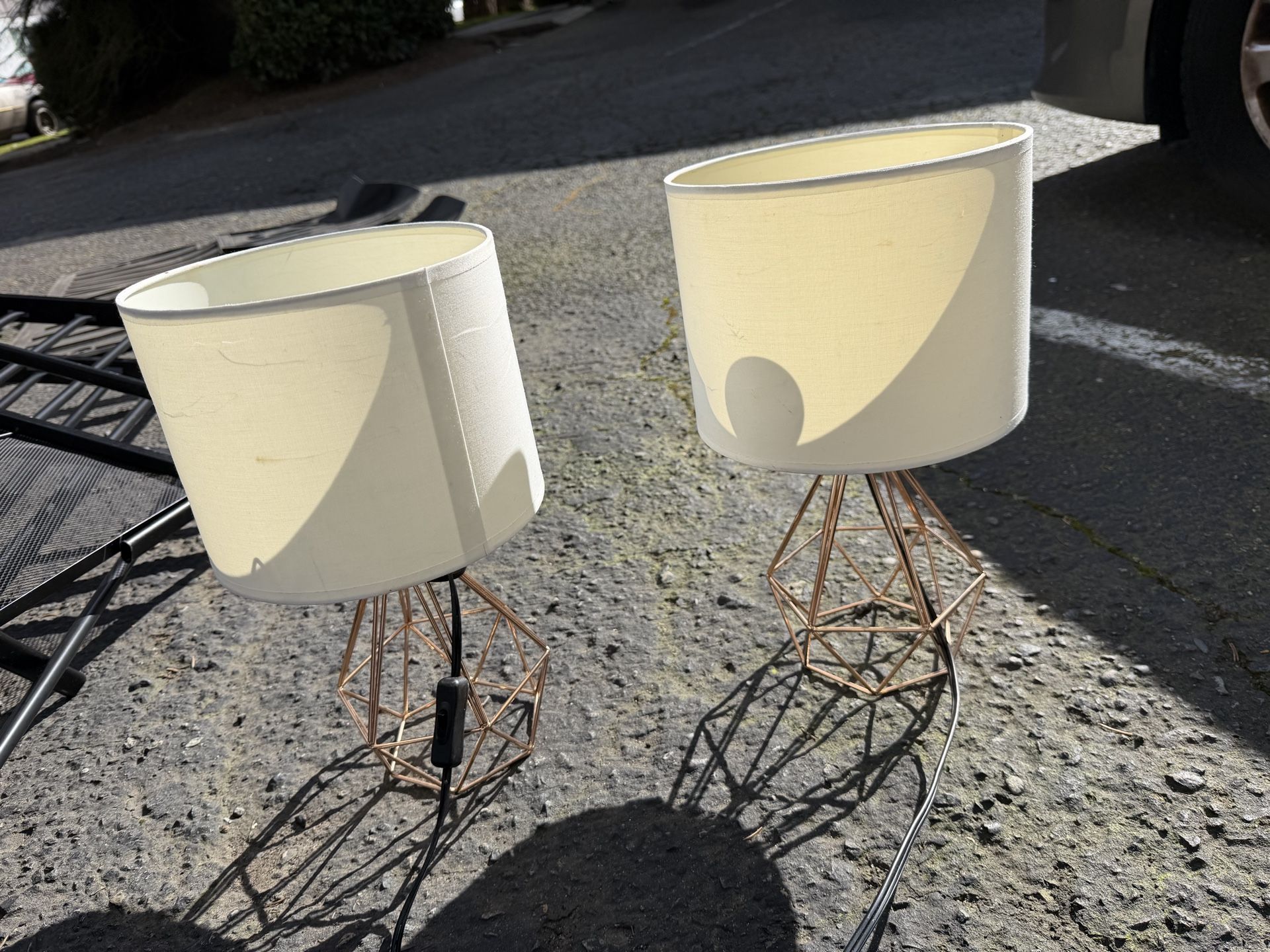 Nice set of 2 table lamps with modern gold base and white shades. Perfect for bedroom or living room.