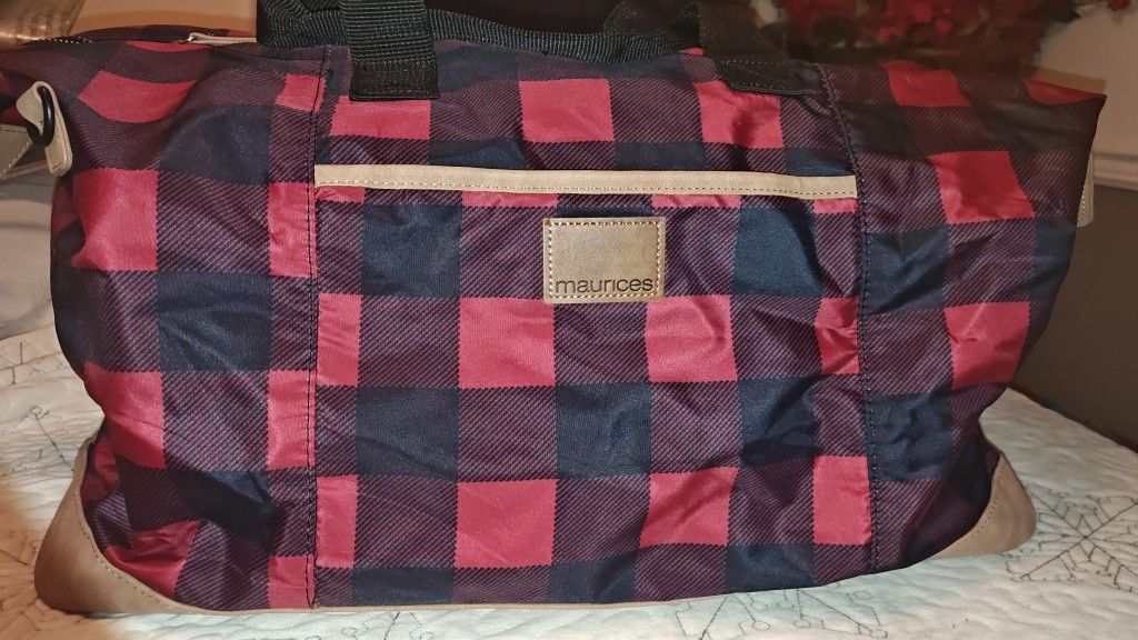 Maurice plaid bag (red and black color). Size: 19.75 X 13.5 estimate 20 " in length. The bottom color is a tan not sure if it is pho leather or side but very soft. The outside bag has black strap handle in the middle on each side. It is new with tags but DOESN'T have long straps. Snap the button on each side of the bag. It can be a travel, diaper, or a girl gym bag. Please look at photos with tap measurements.