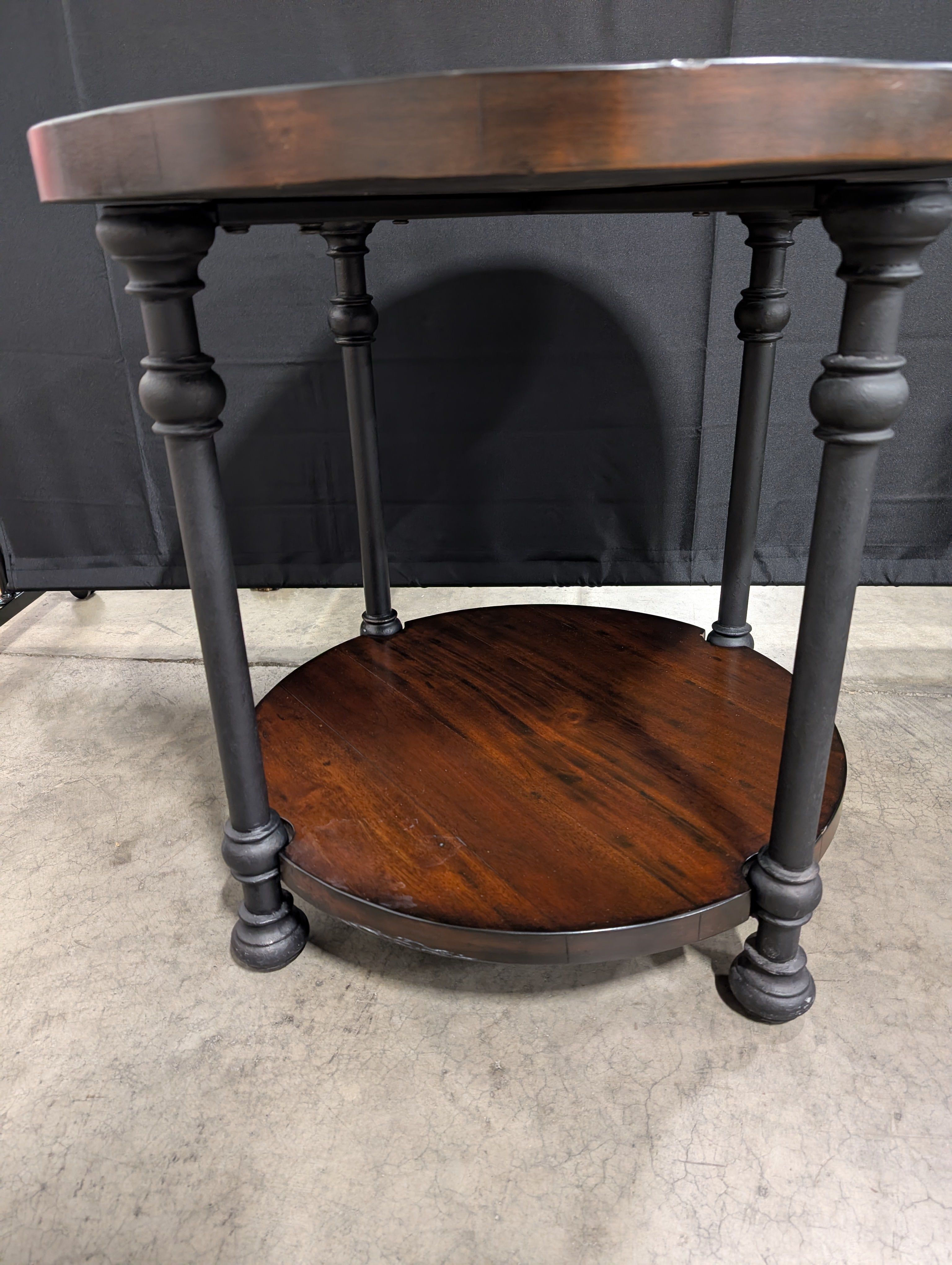 This round side table features a dark stained wood top and a matching lower shelf. Four turned black-finished legs connect the two circular tiers. The table presents a sturdy, multi-level design.