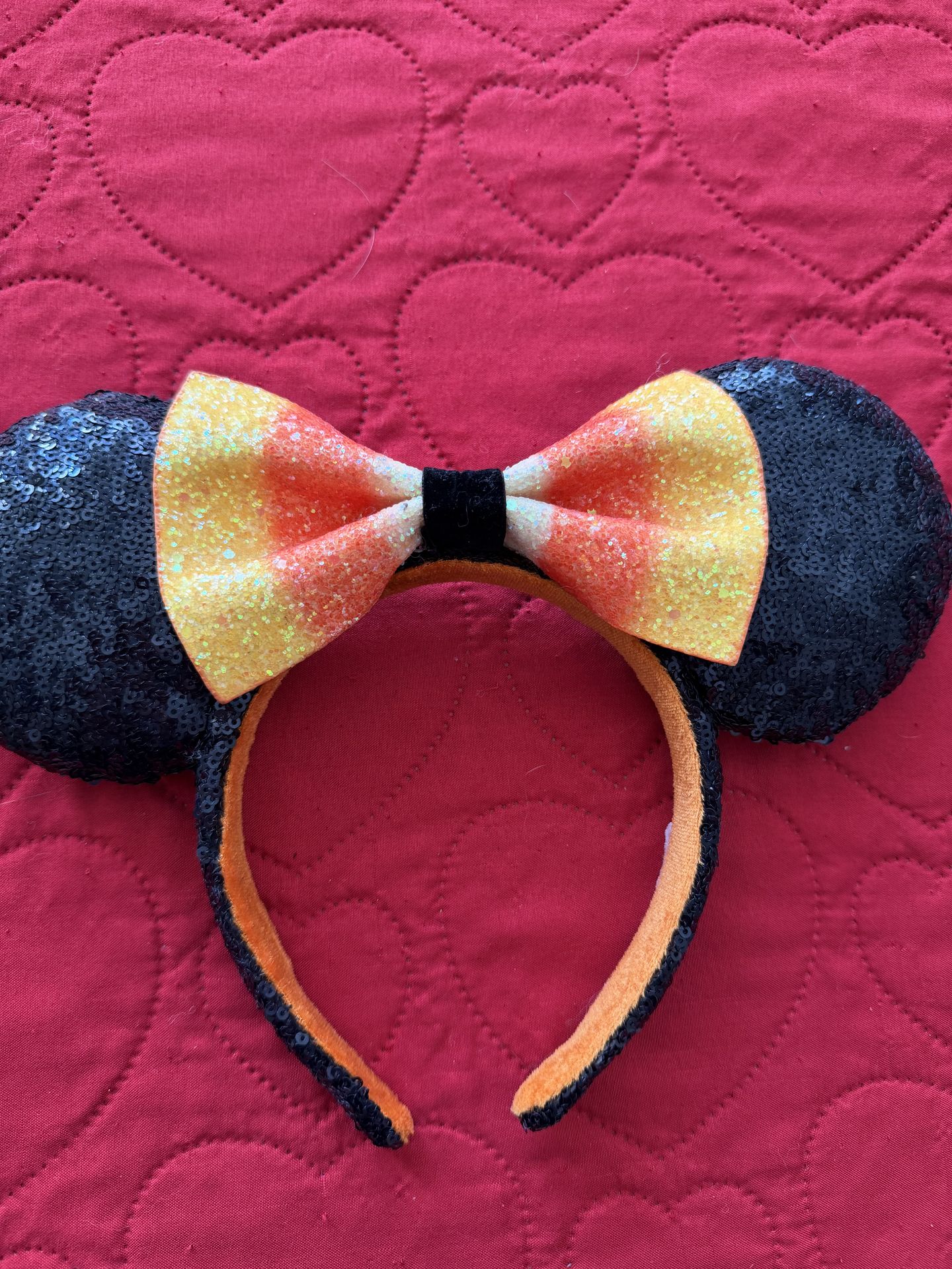 • Design: Features classic black sequin ears and a vibrant candy corn-inspired bow (orange, yellow, and white gradient). • Comfort: The headband is lined with a soft orange non-slip velour fabric for a comfortable fit all day in the parks. • Condition: Great pre-owned condition. The sequins are intact, the bow is secure, and there are no major flaws (see photos for details). • Authenticity: Includes the "Disney Parks" original tag on the inside of the headband.