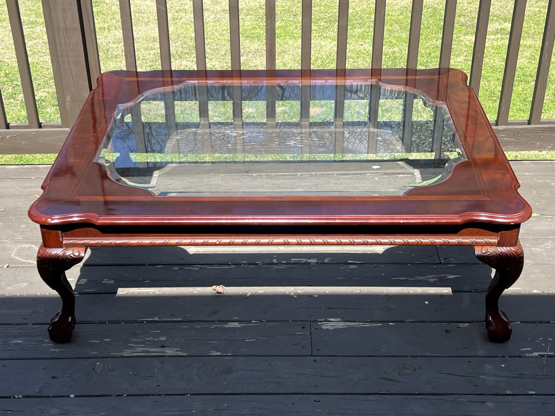 Formal living room coffee table VERY NICE !! Elegant Wood with a glass top High quality 50 inches long 40 inches wide 16 inches tall