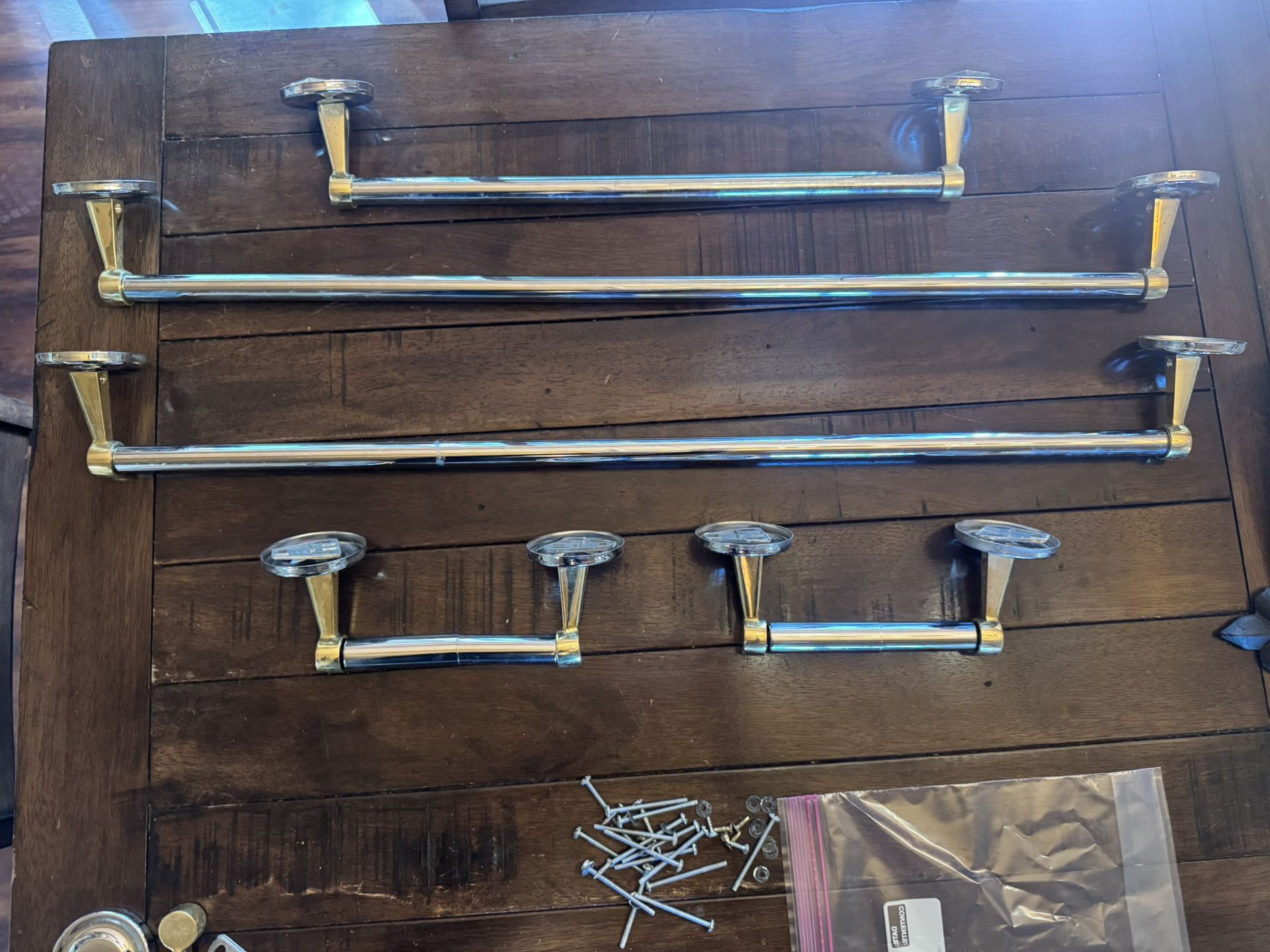 Brass and Crome bathroom hardware towel bars, and toilet paper holders. Two toilet paper holders two 30 inch towel bars and one 18 inch towel bar. I also have an extra set of hardware for a bar, but I do not have the bar. Also comes with the screws. Everything for $20.