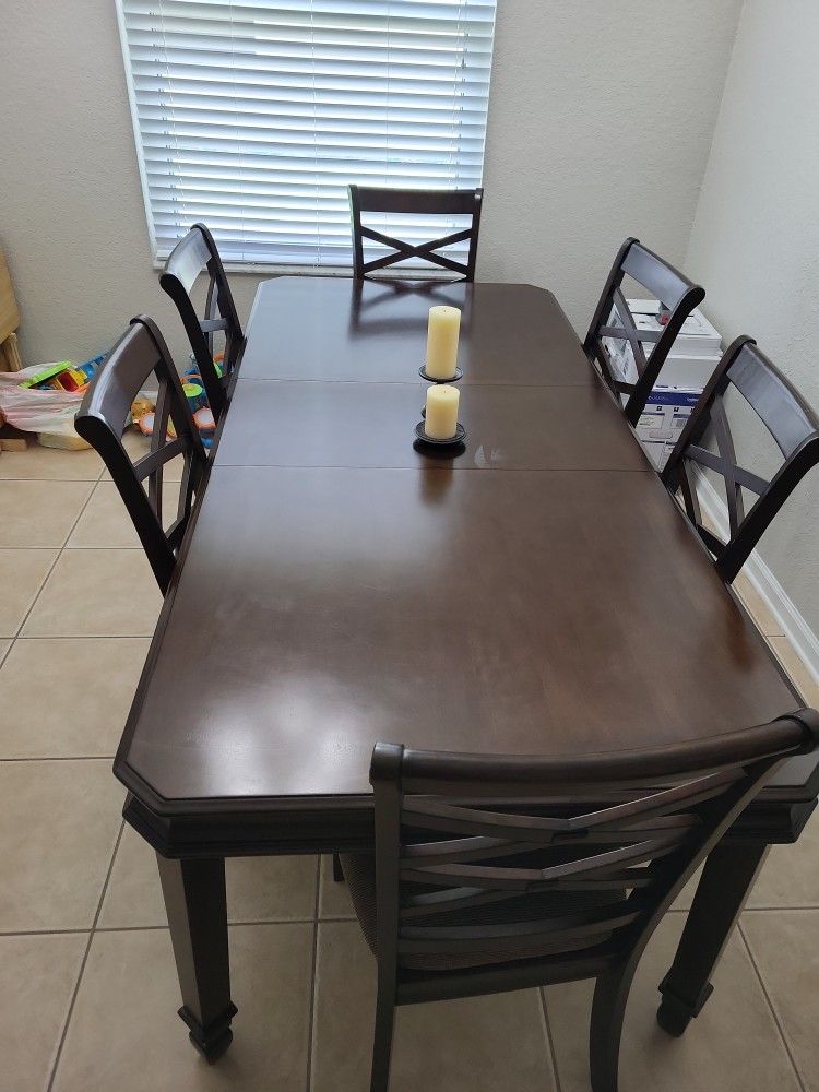 88" x 40" (with leaf) dark brown wood table with 6 matching chairs. Table is 70" with the leaf removed. The damage in pic is on the leaf.