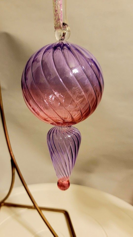 Beautiful Hand Blown Purple Pink Swirl Art Glass Ornament. Blown by hand, these ornaments utilize the twisting technique— creating varying levels of light and dark color based on how it's turned I do have 8 of these so if you are interested in more than one message me and I can create a bundle for you. Imagine how beautiful a tree with all 8 would look! Will ship asap with care Listing is for 1 purple and pink handblown art glass Christmas tree ornament - stand not included. Perfect for your fancy tree or art glass collection