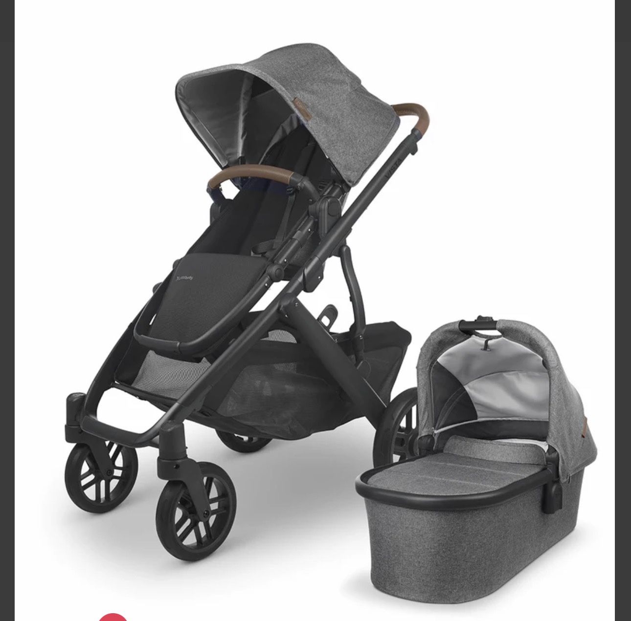 UPPAbaby Vista V2 Stroller & Bassinet - Greyson (Charcoal Melange/Carbon/Saddle Leather) Barely used the stroller a few times since we were out of the country for two years. Newborn bassinet was never used. Like new Bassinet included – newborn-ready & perfect for overnight sleep Toddler Seat – reversible, roomy, higher back + longer leg rest Child Weight Limit: 3 months – 50 lbs (toddler seat) Zip-out canopy with UPF 50+ + mesh panels for airflow Five-point, no-rethread harness – adjusts in seconds All-wheel suspension & softer tires – smooth ride anywhere Extra-large storage basket – fits diaper bags, toys, snacks Front-wheel locks – stability you can see Travel System compatible – works with MESA® Infant Car Seat, no adapters needed One-handed recline + adjustable handlebar One-step fold & self-standing Premium leather accents – handle & bumper bar included All-weather protection – rain shield + bug shield Stroller Frame + Wheels Toddler Seat Bassinet + Bassinet Storage Bag Leather Bumper Bar Seat Rain Cover & Bug Cover Bassinet Bug Cover Upperbaby Hanging bag