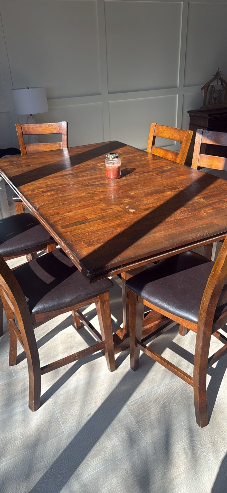 Dining room table is six chairs dark brown One chair has a tear see photos Dark brown wood table with six chairs. There is a leaf that folds into the table. Comes with a leaf 18 inches that folds into the table so you don’t have to store it 74 inches long +18 inch leaf 44 inches wide Six chairs Counter height