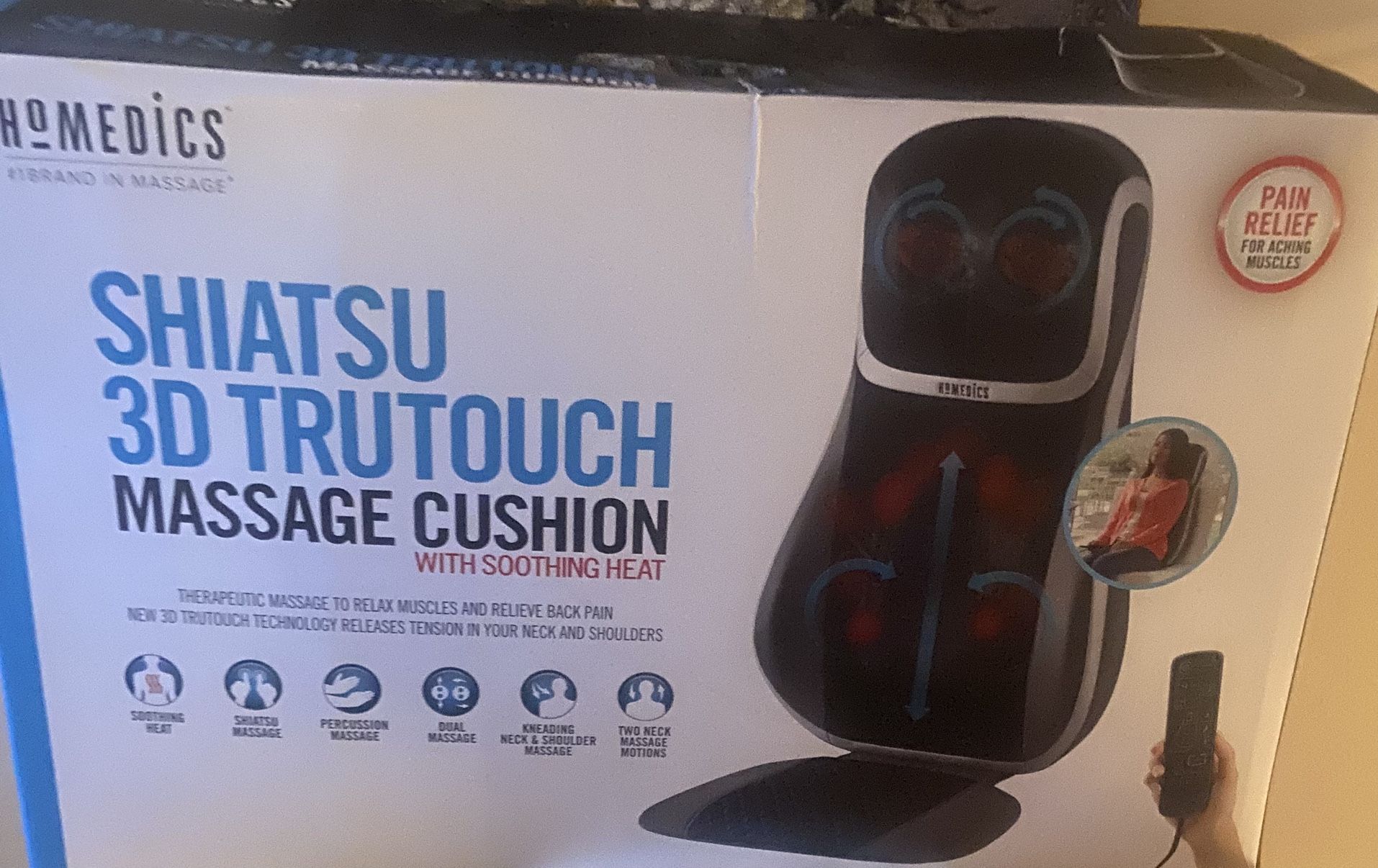 Selling a HoMedics Shiatsu 3D TruTouch massage cushion with soothing heat! The box includes the remote control. It features: - Soothing heat - Shiatsu massage - Percussion massage - Dual massage - Kneading neck and shoulder motions - Adjustable neck height