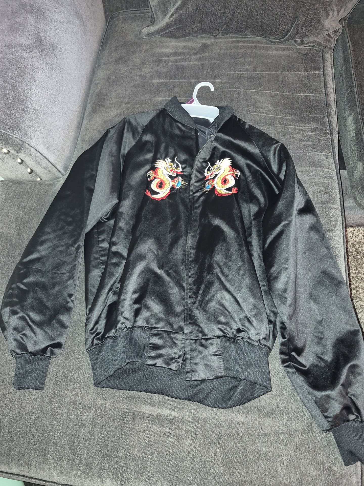 Black satin Japanese style bomber jacket with embroidered dragon design on front and back. Very unique statement piece. Size Large Good overall condition No stains or major damage Only small stitching needed under armpit seam (easy fix)