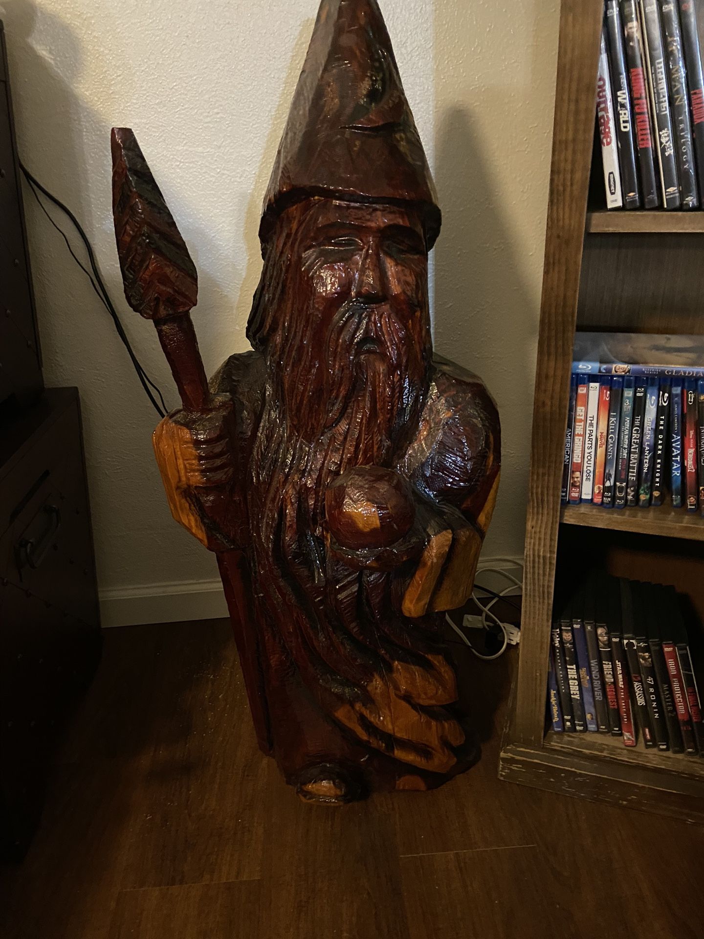 As pictured. This wooden wizard sculpture is the only one ever made. It took the artist I commissioned to make it three tries to finally make it because after completing and curing the staff would break off. He told me he would never do another one ever again. This is an amazing piece I’ve had over 30 years and only reason I’m selling is due to months of downtime due to surgery I had and not being able to make an income. I will accept any reasonable offer