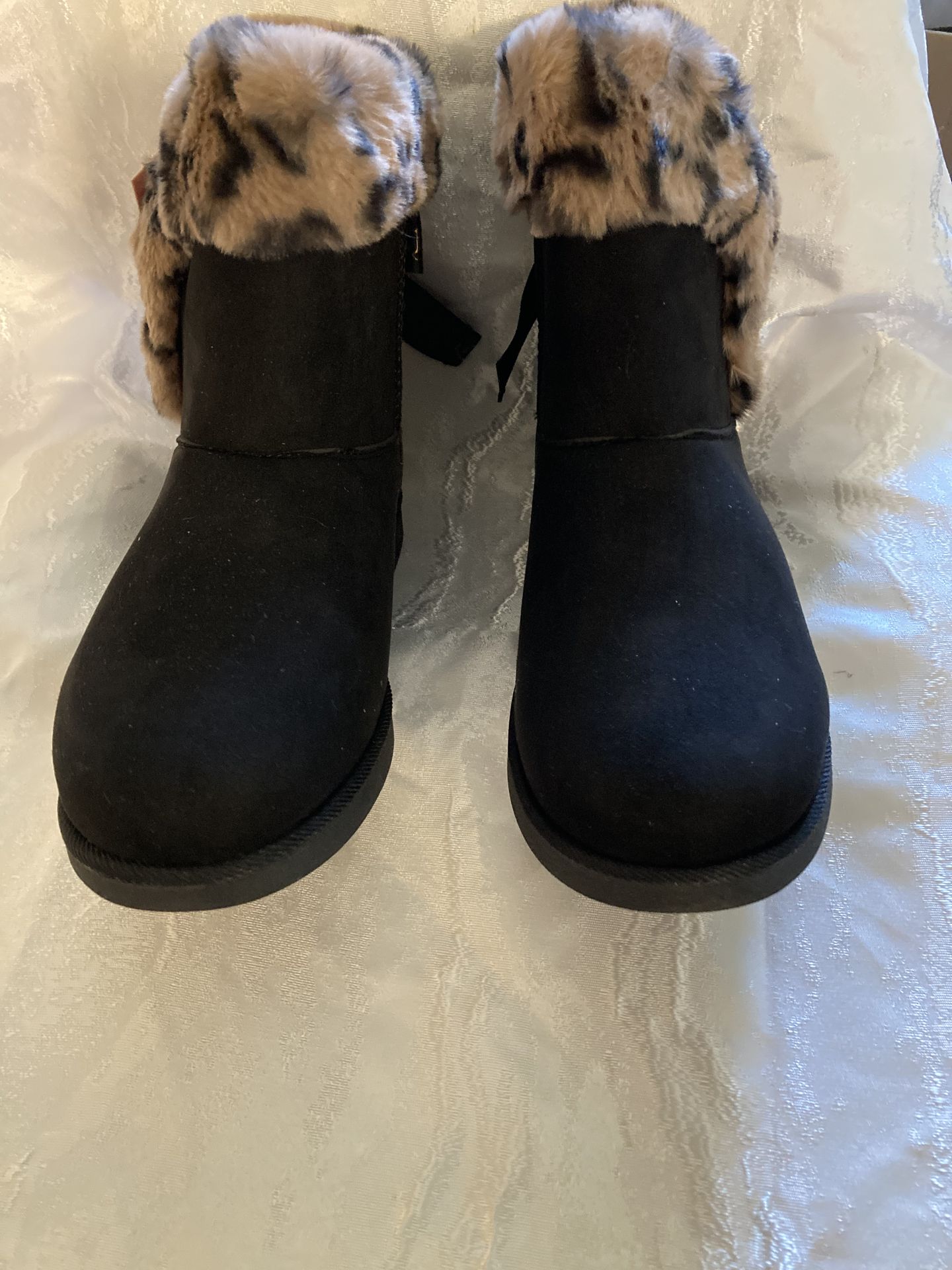 Juicy Couture King women's cold weather ankle boots. The color black with a leopard print faux fur lining and bow detail. Product Details: New and unused with tags. Box has some damage. Brand: Juicy Couture Color: Black Microsuede with Leopard Faux Fur Features: These are slip-on, pull-on style booties featuring a faux suede upper, a plush faux fur lining, and bow details on the back. They are designed for warmth and comfort in cold weather. Smoke-free home.