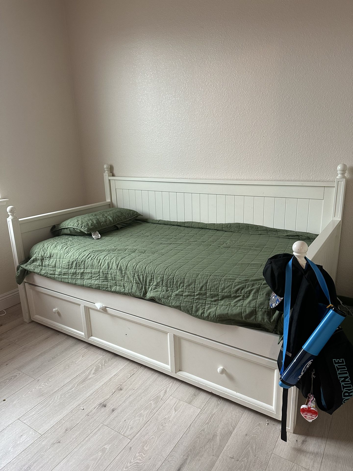 Twin bed with trundle pull out bed underneath ONE mattress included. Can use a fresh coat of paint but no damages at all.