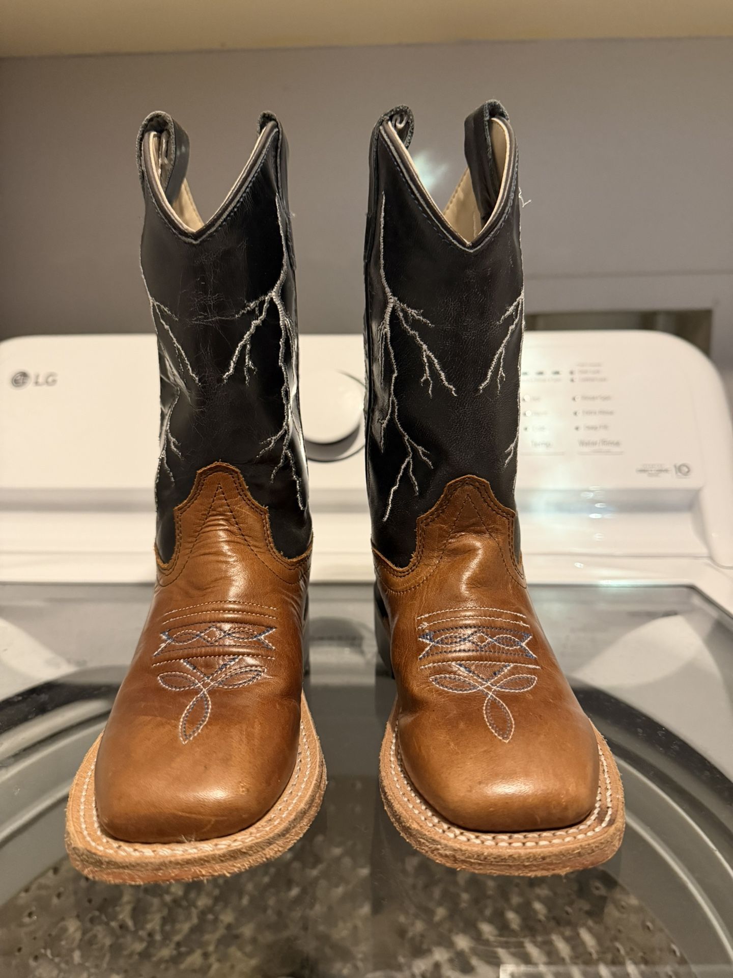 Adorable and durable cowboy boots for your little cowboy 🤠 These boots feature a classic western stitched shaft with a cool lightning design and square toe. They’re sturdy, stylish, and perfect for rodeos, school, church, photos, or everyday wear. • Toddler Size 10 • Great used condition – normal wear • Easy pull-on style • Solid sole with lots of life left My son has outgrown them, but they still have plenty of adventures ahead. Priced to sell at $20. Message me if interested!