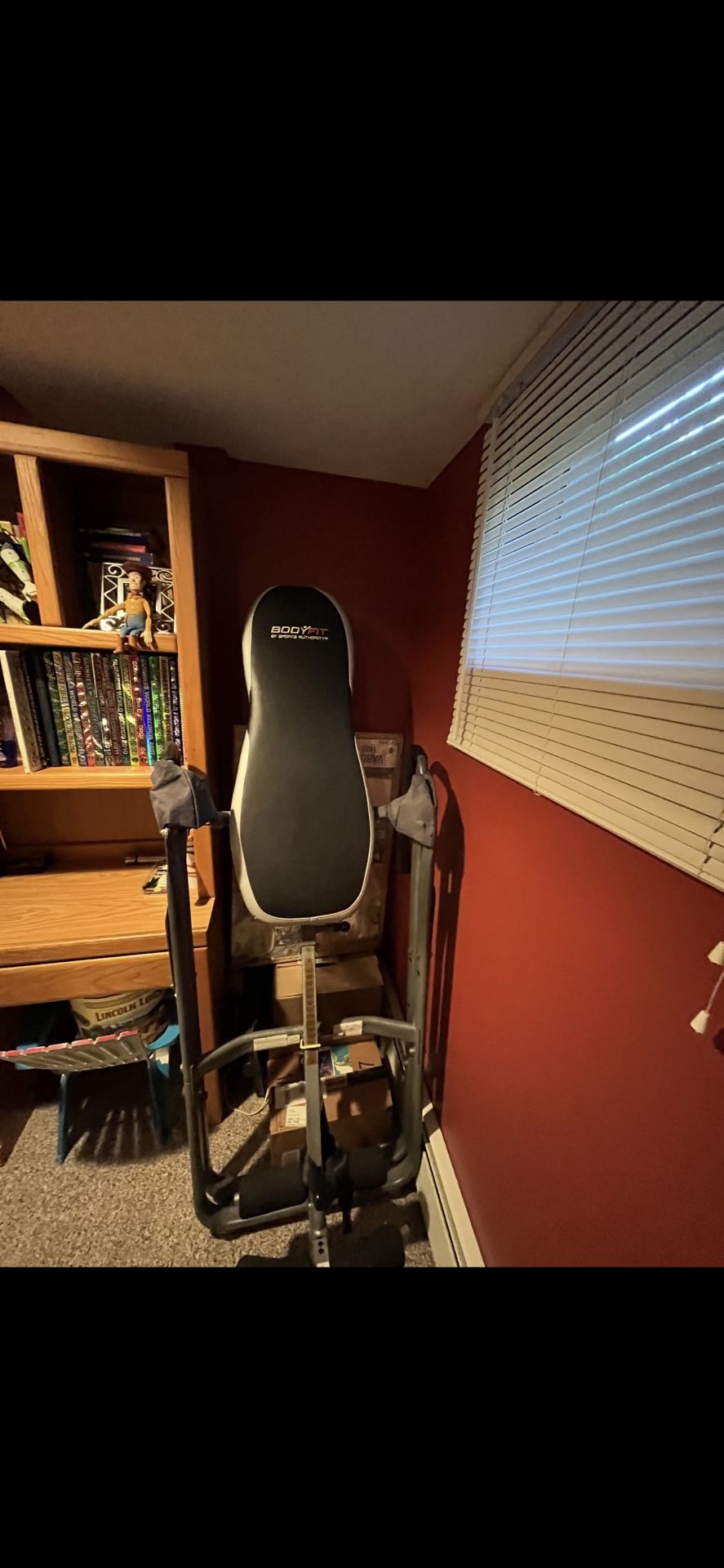 The inversion table leather is in great shape, no rust or scratches and it fully operates. It was a Sports Authority item. In my garage in Roslyn heights.