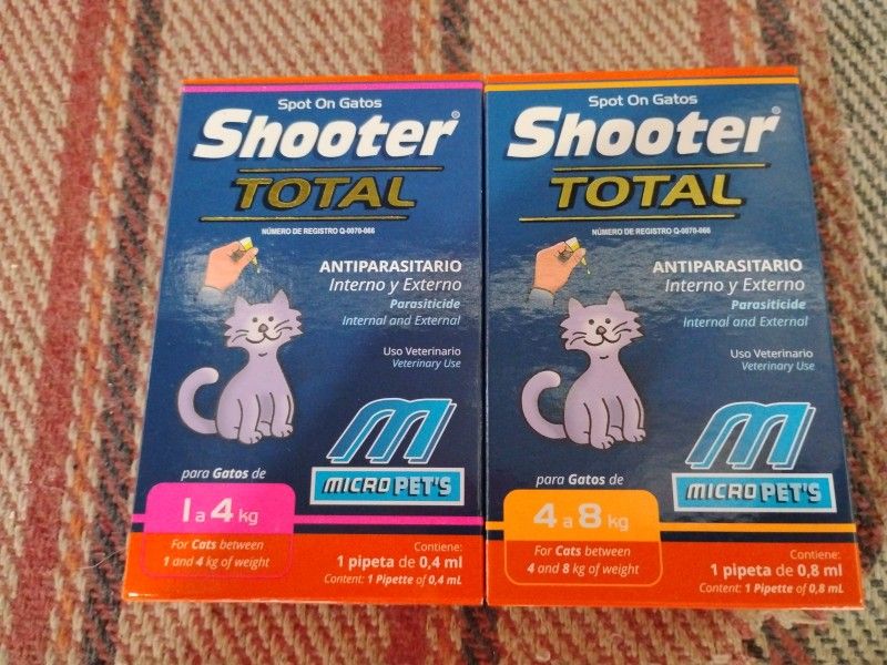 "Shooter Total" Es un producto antiparasitario para gatos, específicamente diseñado para controlar y tratar pulgas, piojos, ácaros del oído, sarna y nematodes gastrointestinales. También previene la dirofilariasis o enfermedad del gusano del corazón. Aquí te dejo algunos detalles importantes sobre Shooter Total: - Composición: Moxidectina (1,0 g) e Imidacloprid (10,0 g) por cada 100 mL. - Indicaciones: Para gatos de 1-4 kg y 4-8 kg. - Dosificación: 0,1 mL/kg de peso, aplicado tópicamente en la zona del cuello. - Precauciones: No usar en gatos con menos de 1 kg de peso ni menores de 10 semanas.