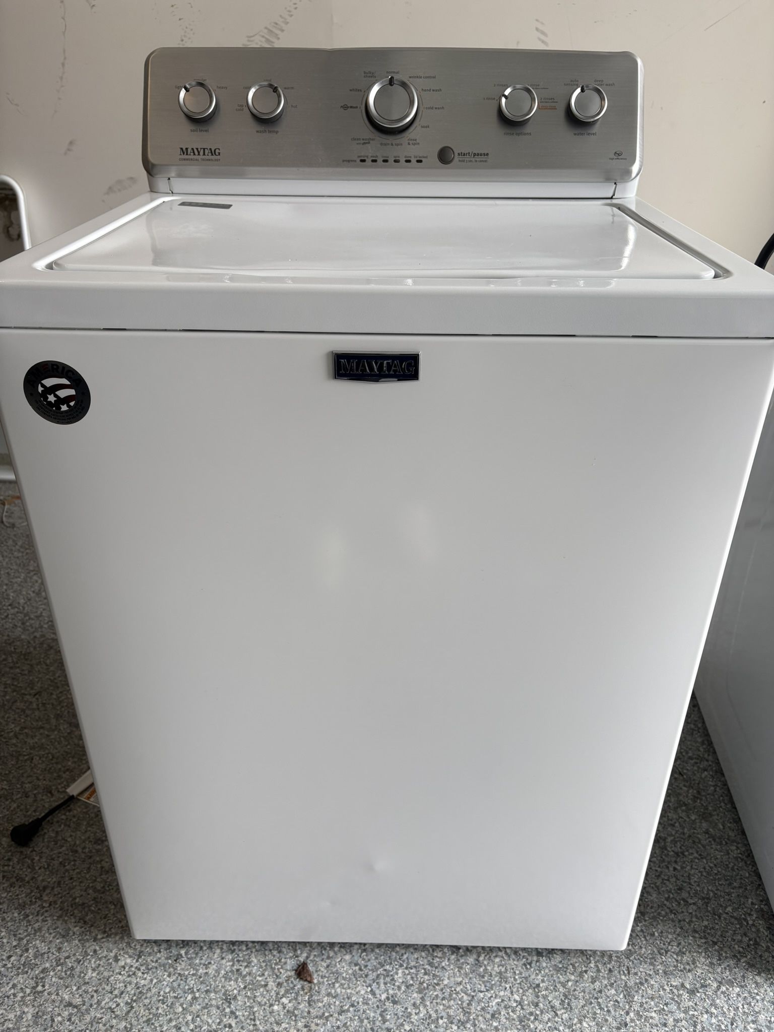 Dryer set in good working condition. Top load washer and front load dryer, hot and cold water hookups with hoses included. Not stackable. Selling only because we brought our own W/D to our new home, these were left by the prior owner. Washer Model: MVWC565FW2 Dryer Model: MEDX655DW1 Washer Dimensions: 27” W x 27” D x 42” H Dryer Dimensions: 29” W x 25.5” D x 42” H Must pick up from Annapolis, MD. Cash, Venmo, or Zelle.
