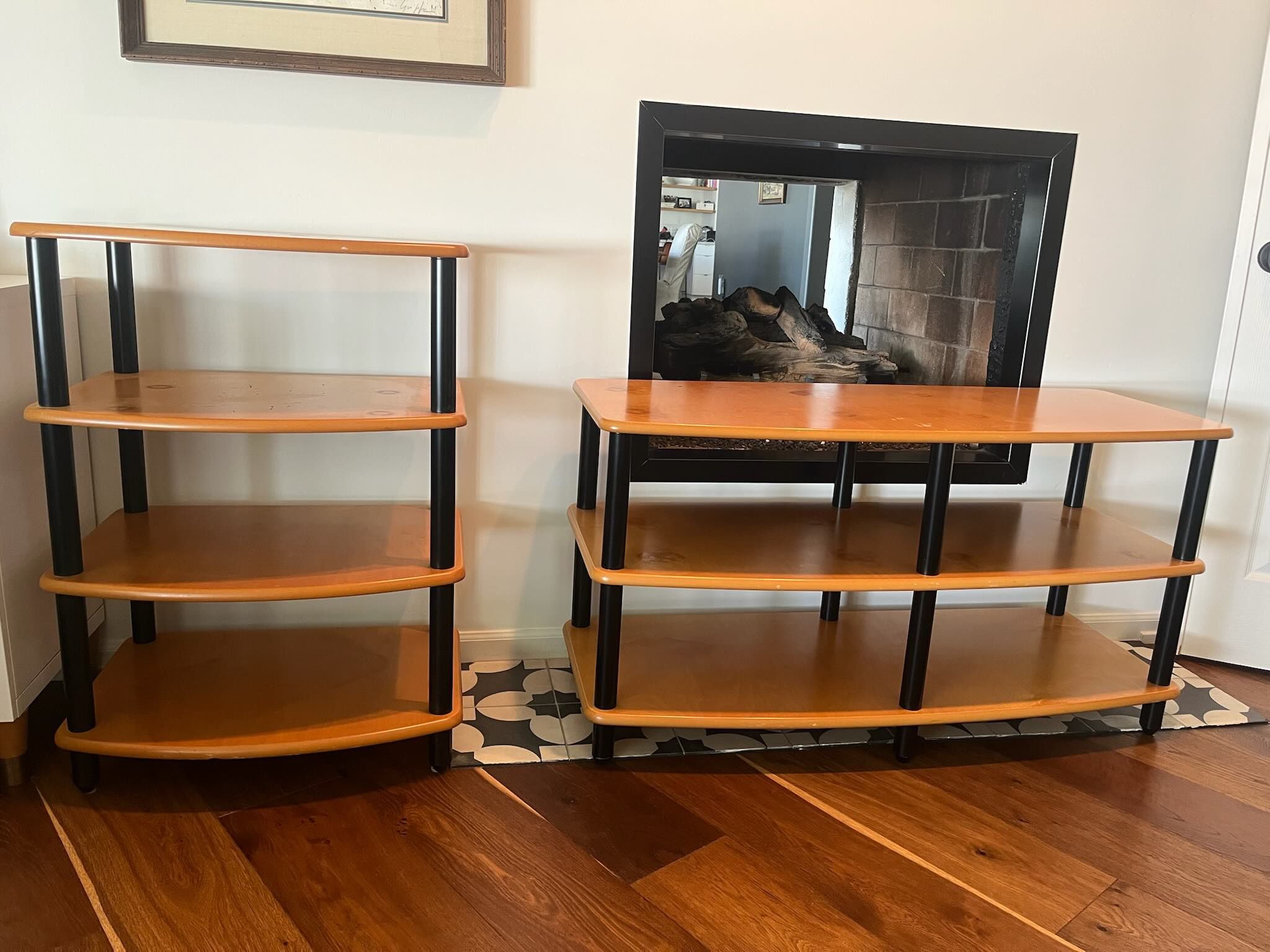 Looking for a high quality stereo stand? These are some of the best audio/video shelving units - Contours brand by Vantage Point Products. Selling two units together or separate. Low three shelf is 45” wide x 24” high. Tall 4 shelf is 24” wide and 34” high, both are 17” deep. Well-made, stable, adjustable, they're beautiful pieces. Has some marks that might be removed. $300
