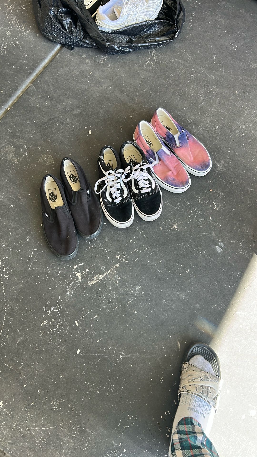 Left to right All blacc slip ons Sz10 8/10 stil clean just wipe dwn $25 Black and white Sz9.5 8/10 $25 Bleached slip on Sz10 8/10 cond $30
