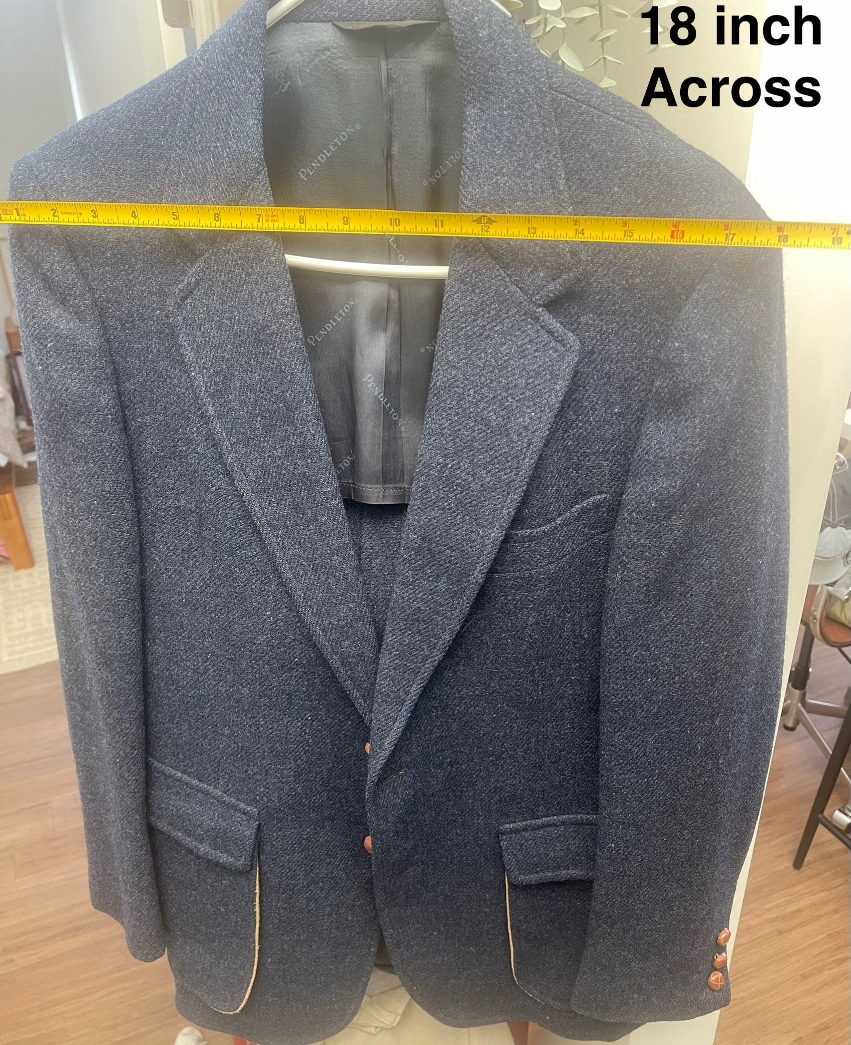 Hello thanks for looking, lightly worn in like new condition. Based off measurements in photos, no tags, only dry clean label. Pendleton blazer full wool size 8 , A chest measurement of 18 inches across (presumably referring to the front measurement of a blazer laid flat, which would translate to a 36-inch bust circumference) for a woman's blazer would generally correspond to a Women's size 8, according to several sizing charts. Size according to measurements , buyer is responsible for sizing.