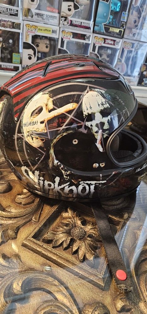 Have a slipknot edition rock-hard brand motorcycle helmet. It needs a new visor as I broke the original one during swapping it out. It's in amazing condition as I only wore it a handful of times. It's a medium size.
