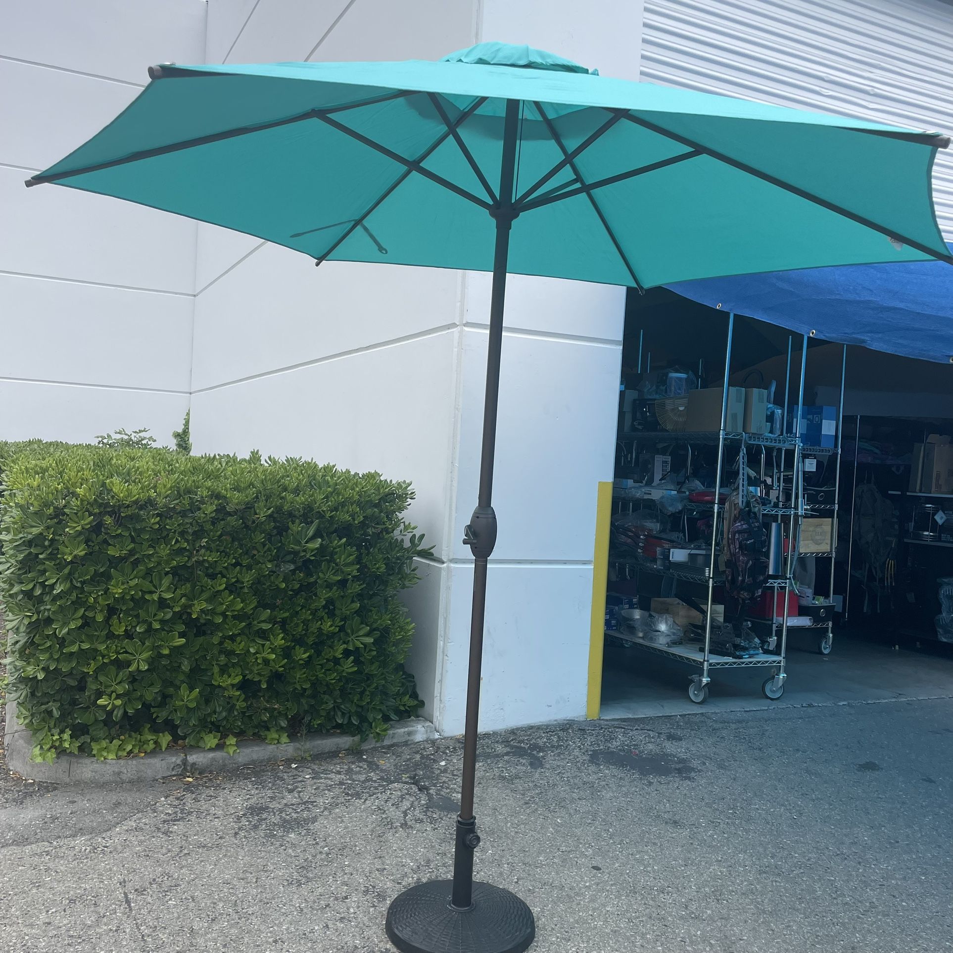 Brand new in the box Includes umbrella and umbrella cover I have bases available for $25 Size: 9ft Material: Polyester Frame Material: Alloy Steel * Convenient crank opens/closes system and handy push button tilt, even easy to use for kids and the elderly. Keep the sun at the back. * 1.5in diameter rust-free bronze aluminum pole and 8 steel ribs provide stronger support than standard round poles. Air vented top enhances umbrella stability. * 100% polyester canopy fabric features fade resistant, water repellent, sun protection. Provide a perfect shade for your patio, garden, deck, backyard, pool, beach life. B1