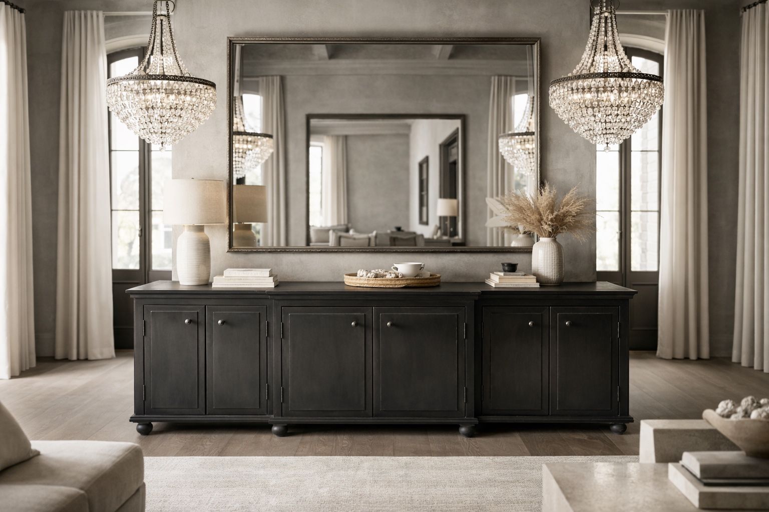 Restoration Hardware solid wood sideboard / console. Very sturdy and well-made piece. Both the left and right sections include interior shelves. The center section does NOT have shelves β Iβm not sure if it originally had them or if they were lost during the move, so I want to be clear. Dimensions: π 90βL x 16βW x 31βH