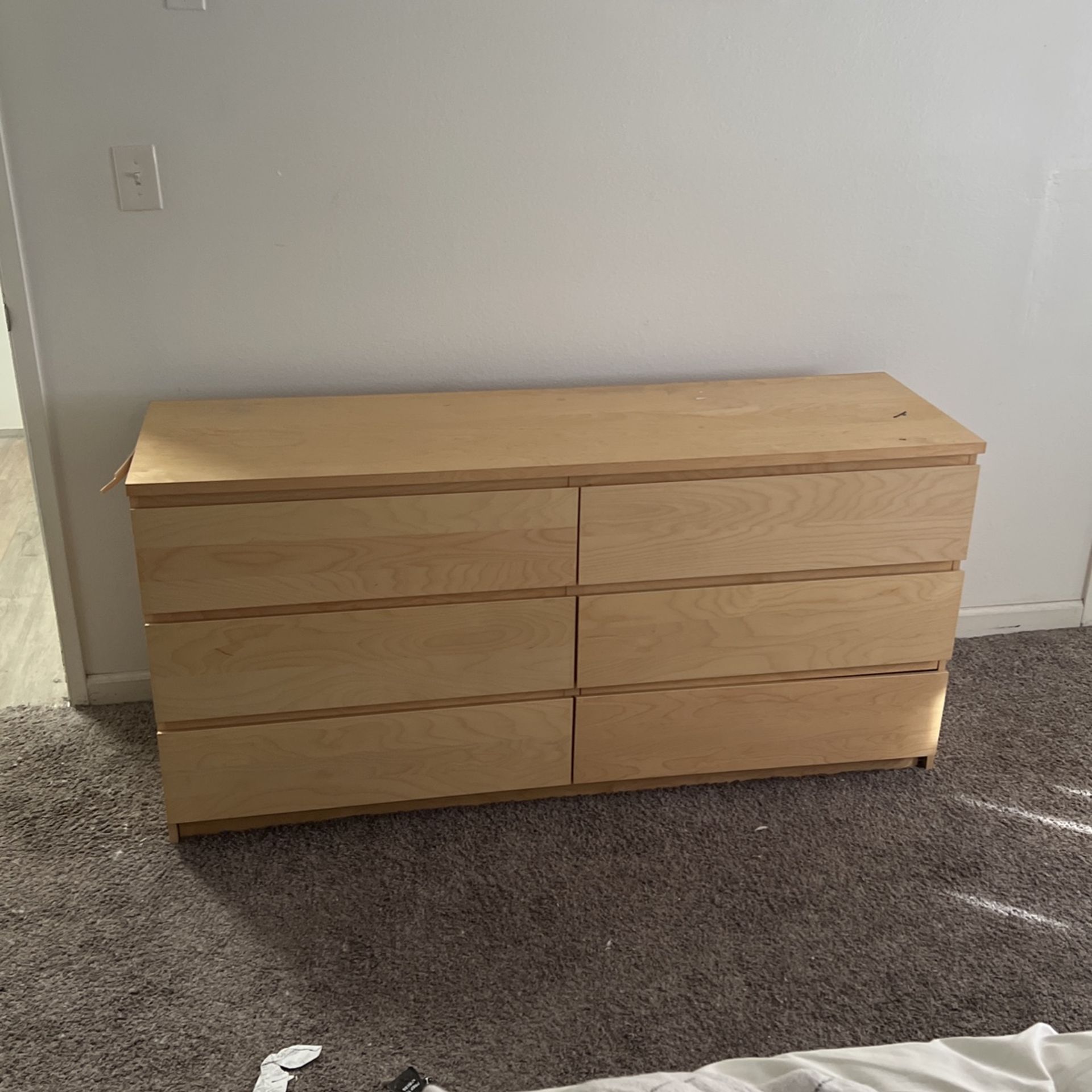 Six drawer wooden dresser. In OK condition. Bottom right drawer is broken. Must be willing to come pick up from 2nd story building, no delivery, no assistance moving. Length: 63 inches width: 19 inches height: 30.5 inches