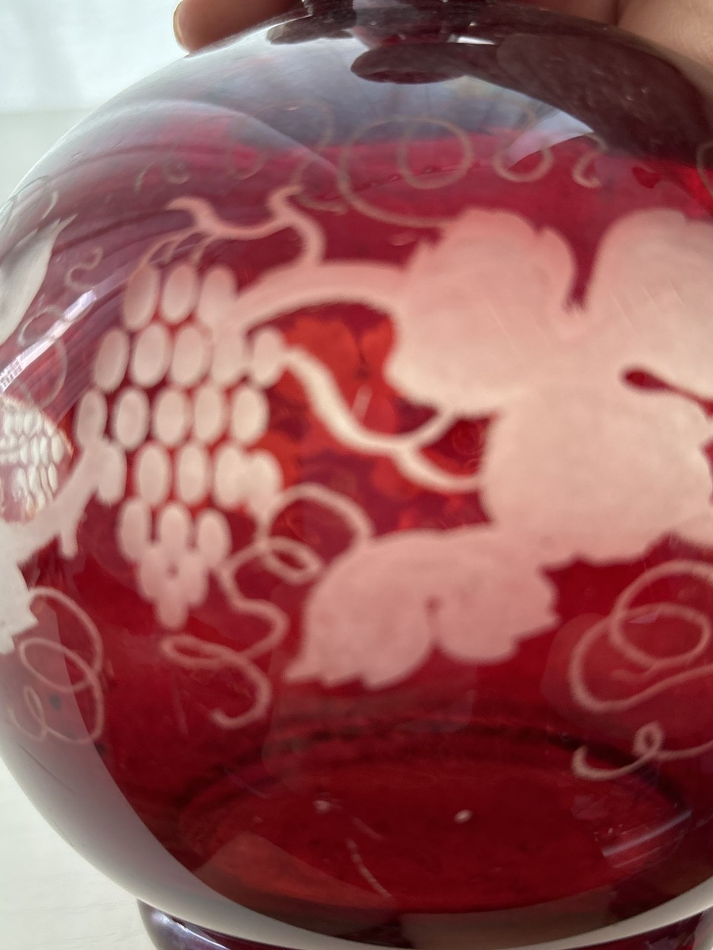 Vintage Possibly Antique Bohemian Cranberry Glass Decanter w/ Etched Decoration
