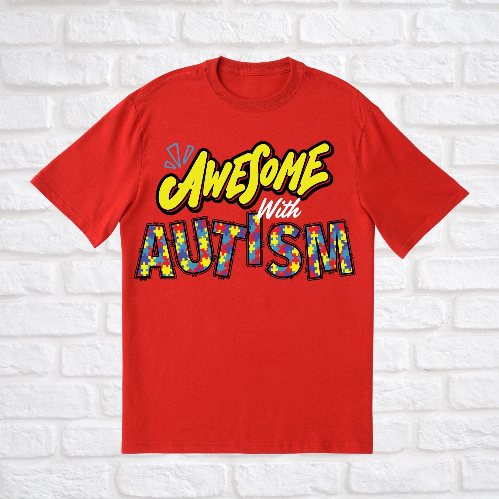 Awesome Woth Autism Houston sCustom T-shirts Autism Awareness TShirt in white with Puzzles 🧩 in Red
