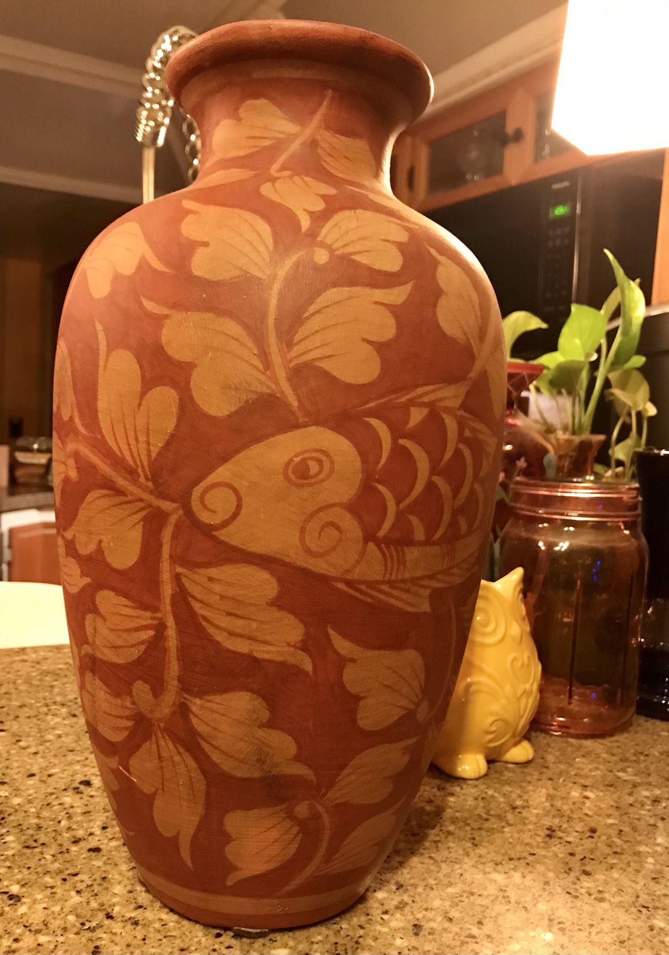 CLAY VASE approx 13” tall 7”wide. Stenciled quality decorative design. Has large fish design surrounded by leafy vines covering the outside. No chips or damage. Felt feet on the bottom to not allow clay to scratch surfaces 23.00. Thanks for looking and check out my other offers as well