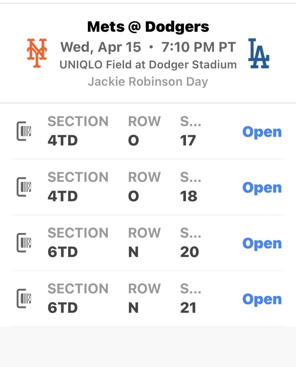 2 pairs of tickets for Dodgers vs Mets Wednesday April 15 . 100 per pair or 200 for both pairs