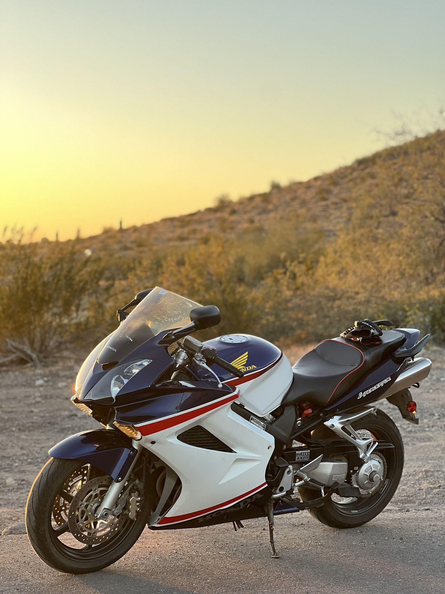 Stock Anniversary Edition VFR800 Interceptor! Yes it has VTEC and yes it works😂 this bike is so comfy on long rides and way too much fun on regular commutes. Owned by an 80 year old guy before me who did every single service interval on time. It really shows. Brand new fuel pump, Valves serviced, all fluids flushed, new brake and clutch lines, just needs tires and chain which I can do for you just buy the parts🤘🏼 Really love this thing it’s something else but I have way too many bikes and it’s taking up space.
