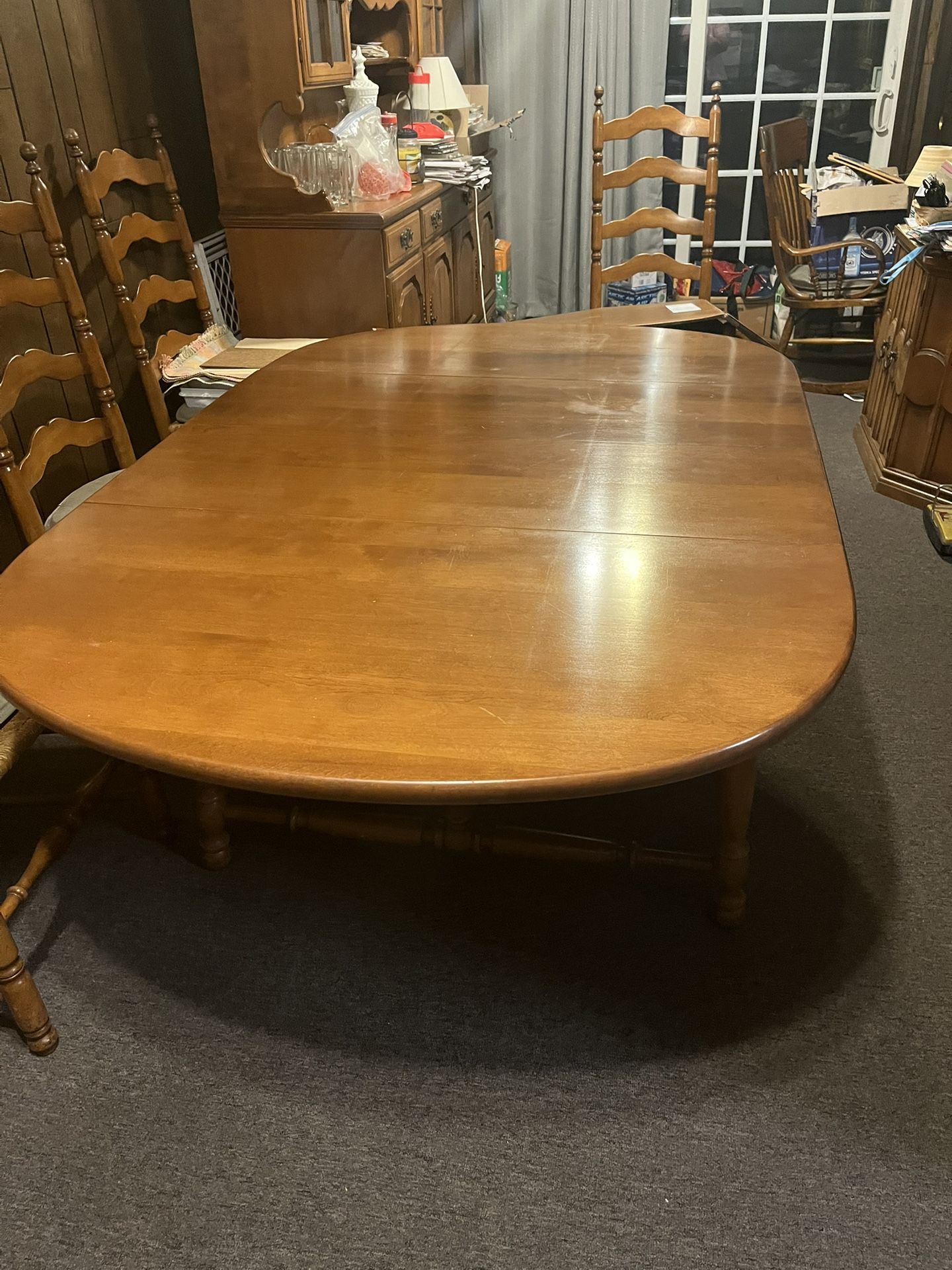Table is 29 inches tall; 42 inches width; 41 inches in length plus 2 13 inch and 2 9 inch leaves giving a total possible length of 85 inches. 8 chairs Teacot