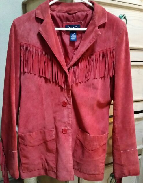 Please inquire on day you plan to see / purchase item only Red 100% Genuine Fringed Leather Jacket Excellent condition Fully lined 18" across shoulder, 20" across chest, 28" long $35.00 firm price no exceptions
