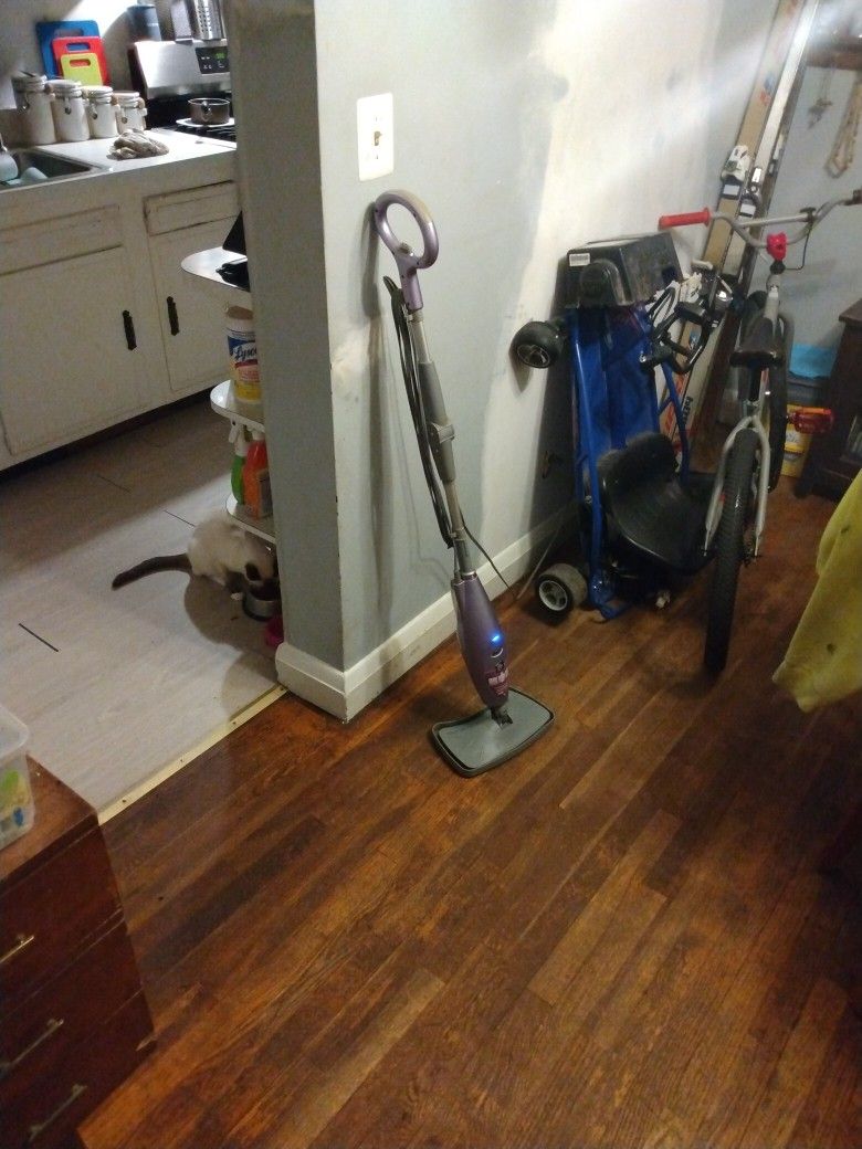 Shark steam mop. Works perfect .... Got something else from my mom's so don't use it much any more and am passing it along because they aren't cheap new.. only thing you need to get is a mop pad bc mine is obviously used and old . It has back saving mode as shown in picture it bends in half so u don't have to bend down to get under the dinning room table coffee table ECT... Ect.... U can clean hardwoods vinyl tile and cvt vinyl... Along with carpet too.