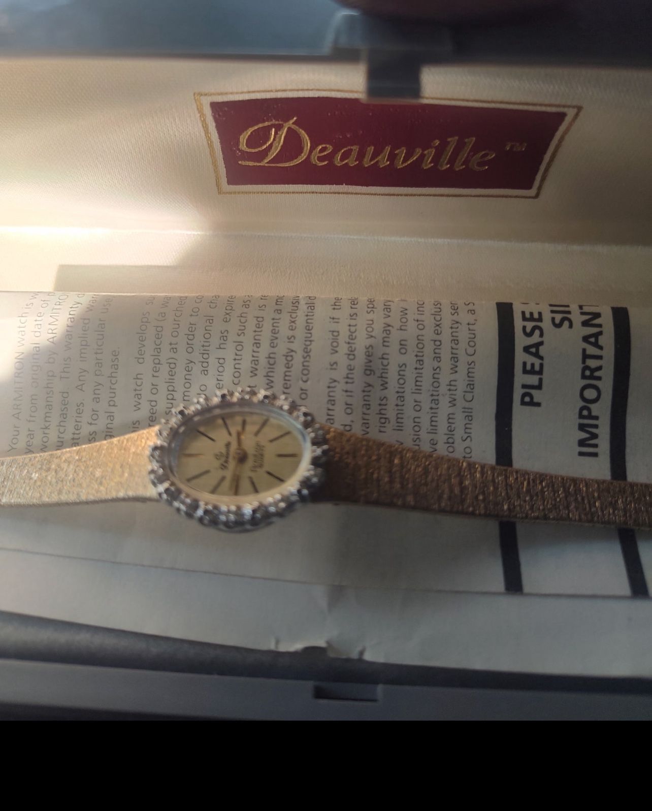 Beautiful Gold Armitron watch, still in its original box with manual. I just got a upgrade for my birthday no longer need this one.