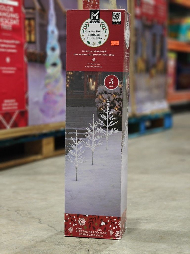 Crystal bead pathway lights Adorned with 150 twinkling LED wire lights Available in Warm White and Cool White Includes 3 stakes and a 5' lead cord for convenient setup Suitable for outdoor use
