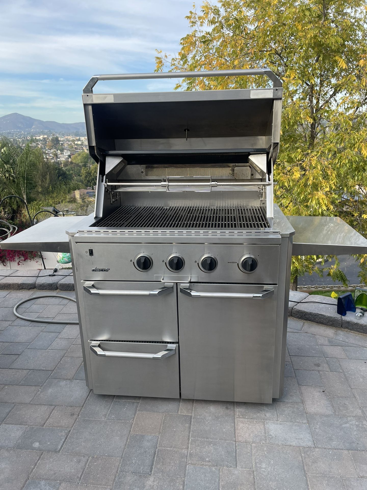 This grill provides superior cooking performance and is designed to provide even heat distribution and precise temperature control. This grill sold new for $4200, the cart for $2200. American designed and made in the USA using virgin 18 gauge stainless steel. Three main burners that produce 20,000 BTU’s each and infrared rotisserie burner. Professionally cleaned and restored. Natural gas but can be converted to propane.