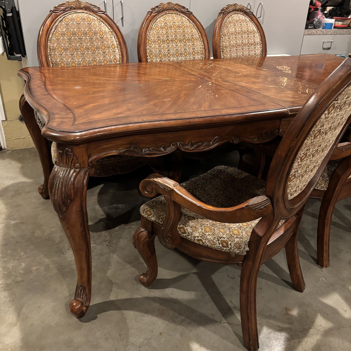 - Wooden Dining Table w/ 6 chairs. - Can remove the middle part & make the table smaller in length. - Chairs might need some upholstery repair. -Other than that everything is in good condition. - $200 OBO. Negotiable