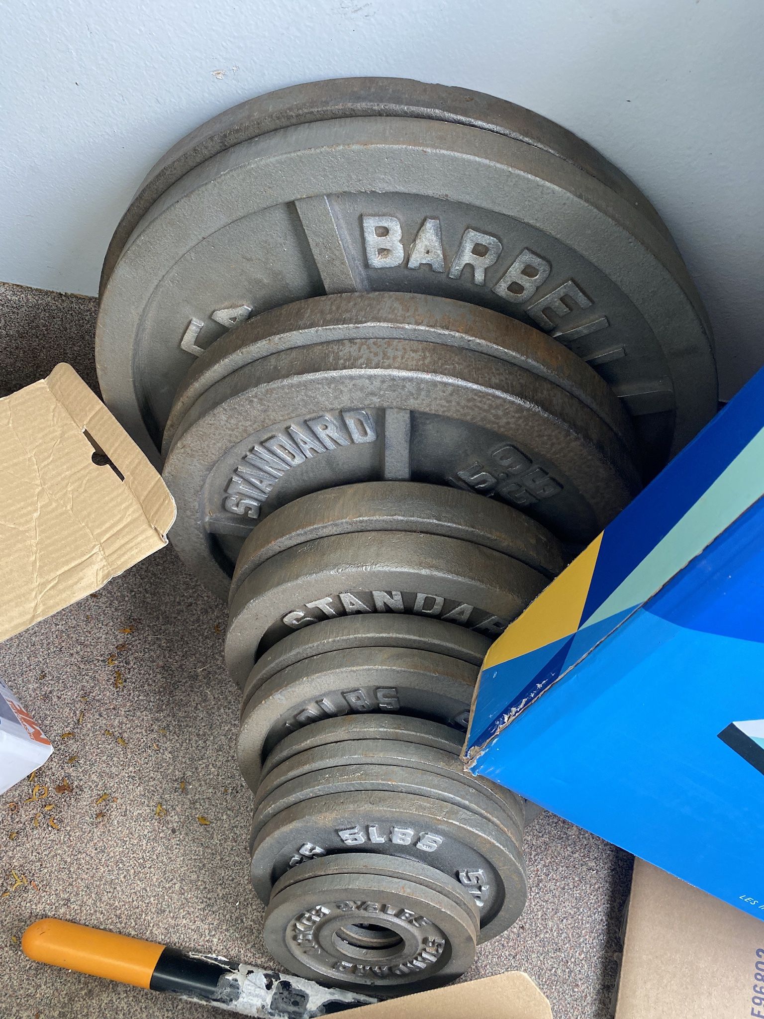 Up for sale is Olympic weight set and 7 ft Olympic bar. Used but good condition. Bar and weight plates are 2” standard size. 45lb x 2 35lb x 2 25lb x 2 10lb x 2 5lb x 4 2.5lb x 2