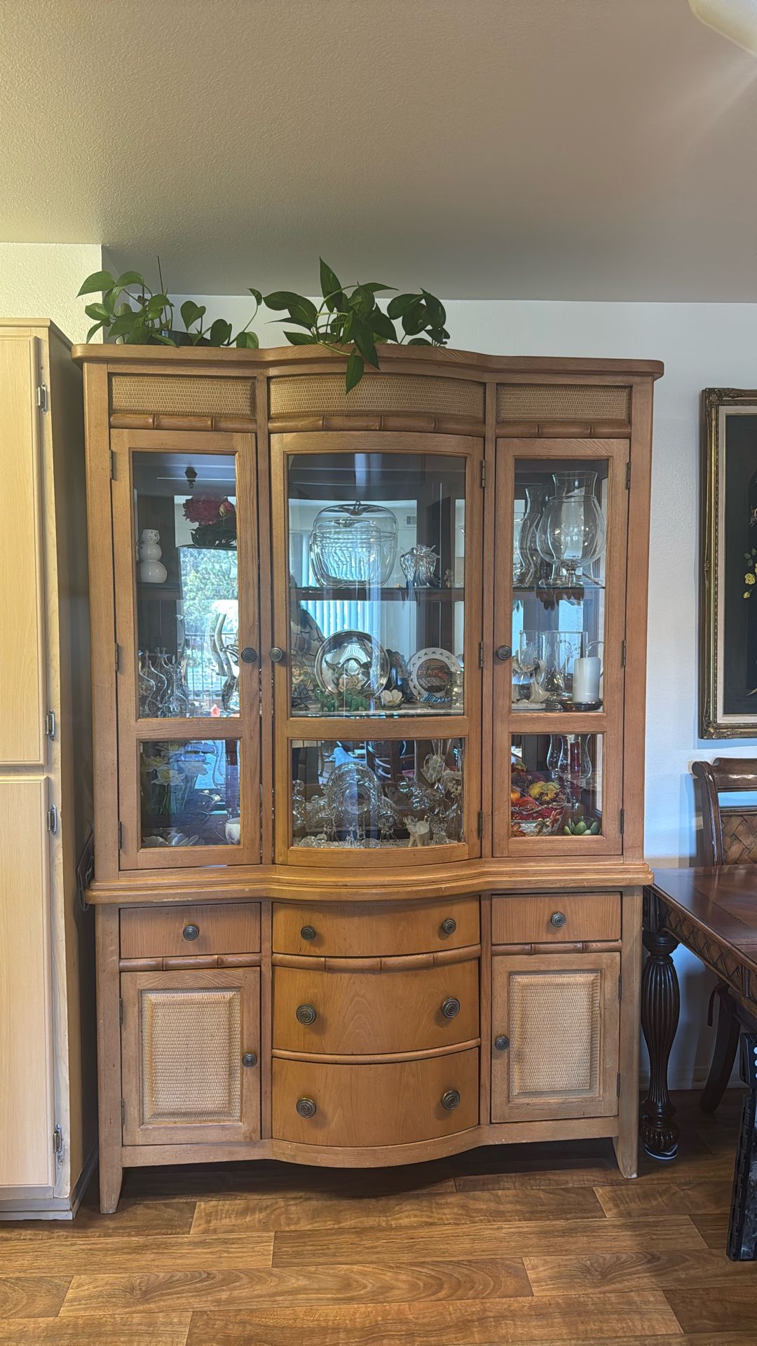 Must pick-up Rooms to Go tropical style china cabinet in a medium finish. There are glass shelves inside with five drawers below. 58"wide x 17"deep x 83"high. Solid wood